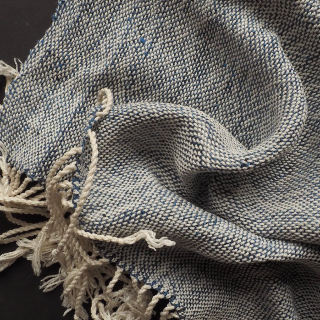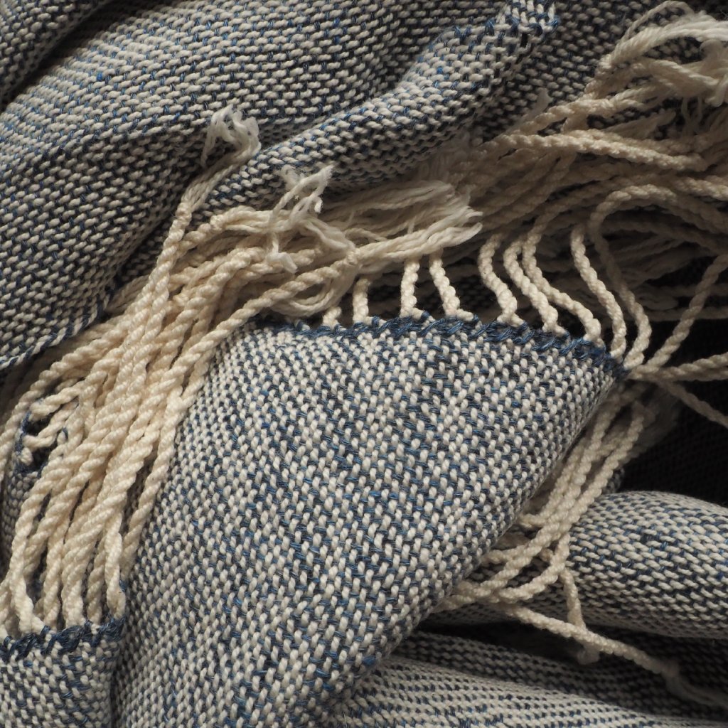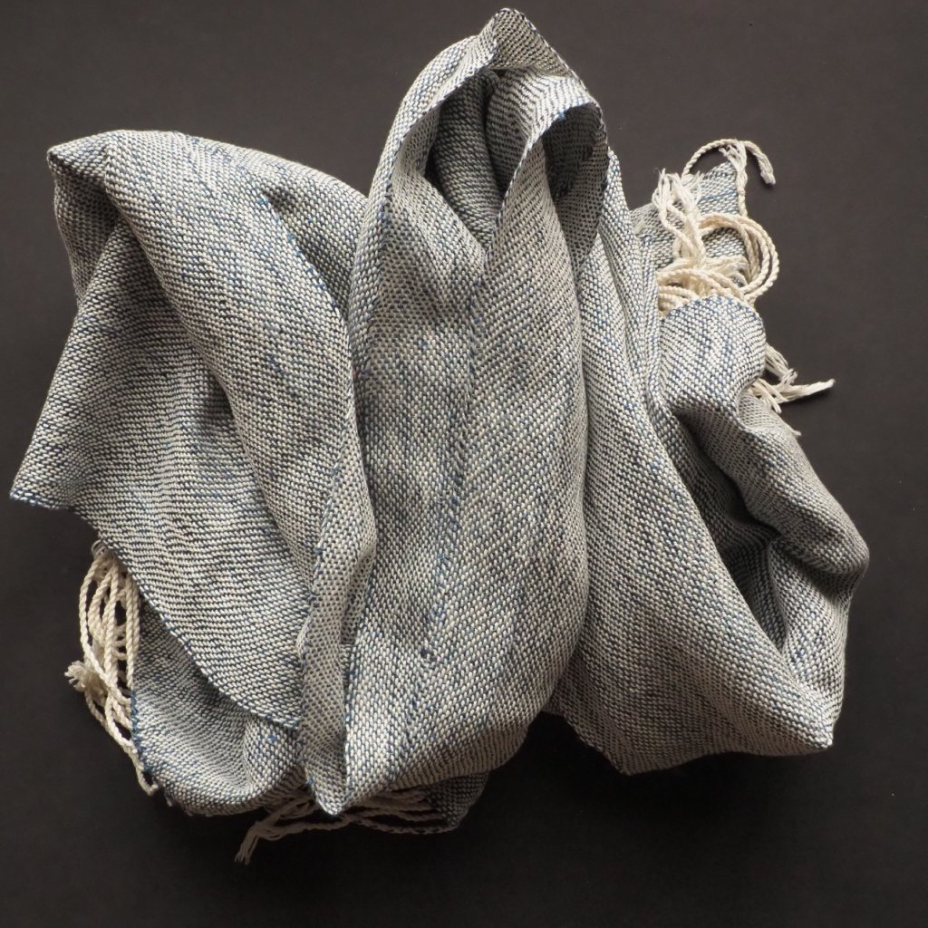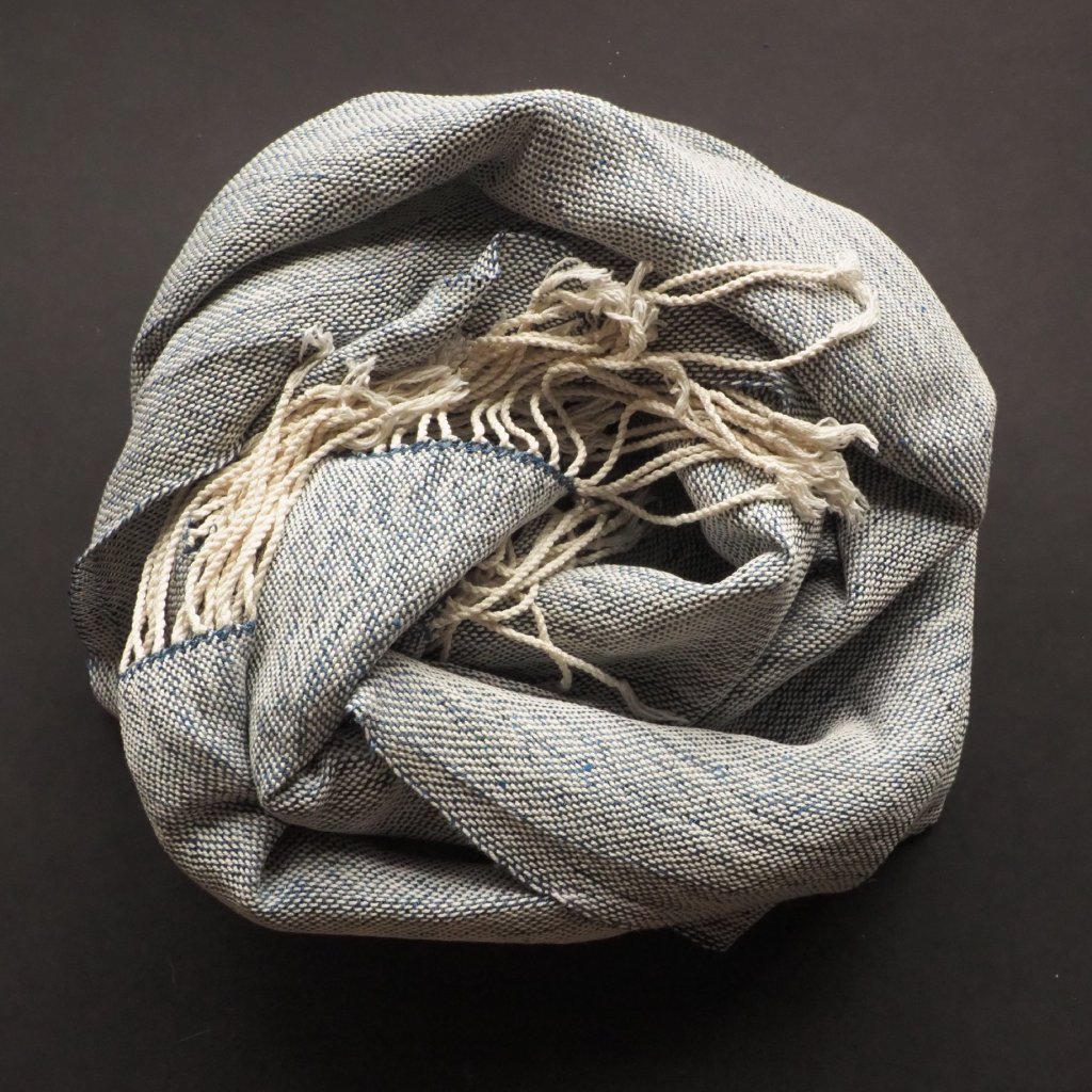 Na stavech, se kterými pracuji nejčastěji a nejraději, se se lnem tká těžko. Je to totiž jen málo pružný materiál, který se v osnově chová dost nepřátelsky, a tak jej najdete v mé nabídce jen zřídka. Když ke mě ale doputuje krásná lněná příze z průmyslových přebytků, kdo jsem já, abych se jí vymlouvala na svoje stavy. A tak jsem tuhle středně modrou lněnou vícenitku zatkala do přírodně bílé bavlněné osnovy o podobné síle. Výsledná tkanina má to nejlepší z obou světů - hebkost bavlny a splývavost a jemný lesk lnu. Barevná kombinace pak dává vzpomenout na porcelán malovaný kobaltovou modří, je nostalgická, přívětivá a přátelská. Kousek je tenčí, a tak jej využijete hlavně od jara do podzimu. Můžete jej nachumlat ke krku když pofukuje od moře, přehodit přes ramena pod sálajícím slunkem, nebo přes nohy v chladném večeru či klimatizovaném vlaku. A v každodenním shonu pracovního města dozdobí každý outfit, od džínů po květované šaty.