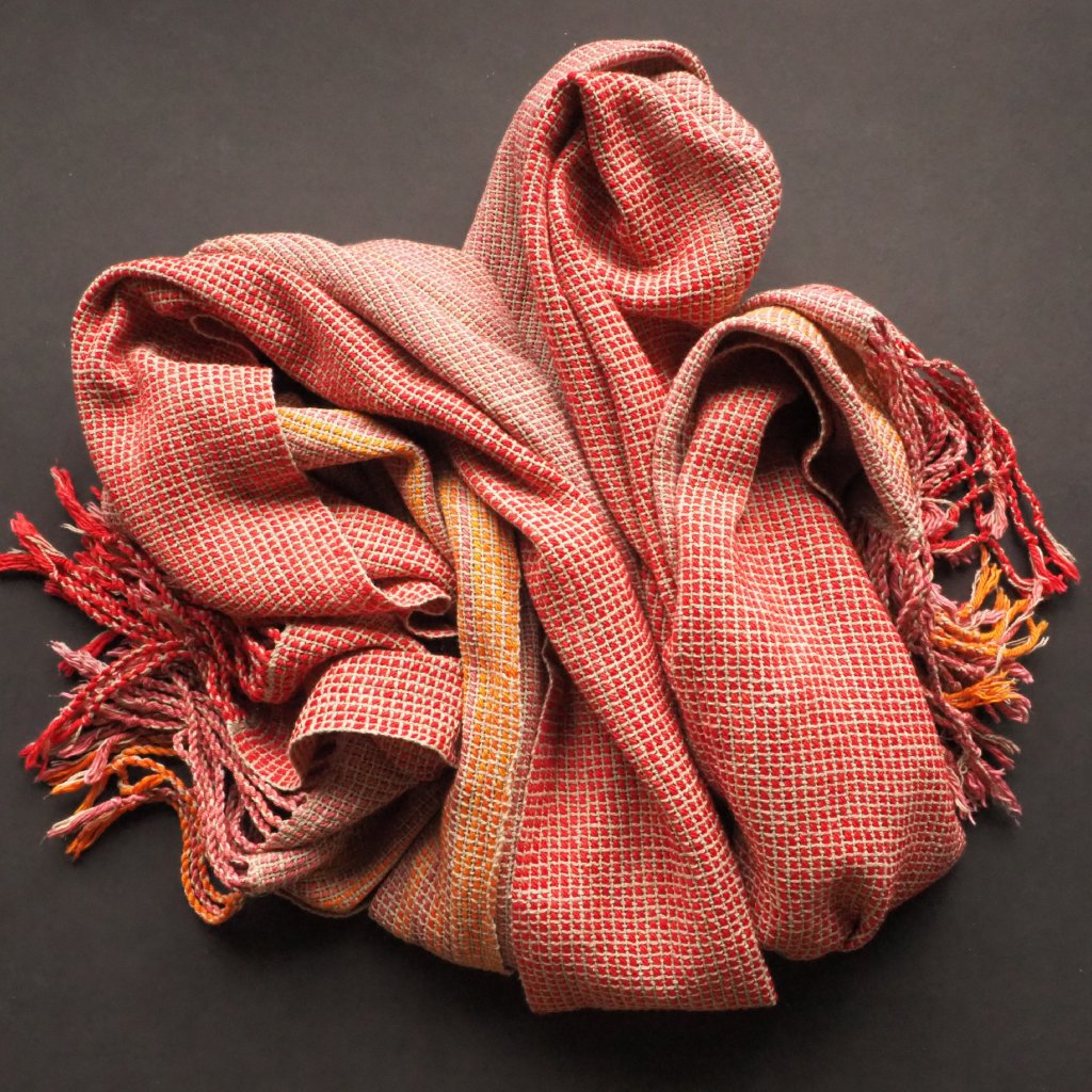 Moje oblíbené střídání tlustých a tenkých přízí tentokrát v rostlinných vláknech - v bavlně. Silná je tu ručně barvená bavlna v jahodově červené, lososově růžové a oranžové, tenká pak béžová bavlna s jemnými nopky. Celkově je kousek spíše tenčí, a díky technice střídání dvou sil příze krásně splývavý. Bavlna sice méně zahřeje v zimě, ale o to víc si ji užijete v teplejších měsících, včetně toho nejteplejšího léta, kdy ochrání před spálením sluncem a přinese komfort v klimatizovaných místnostech a dopravních prostředcích.