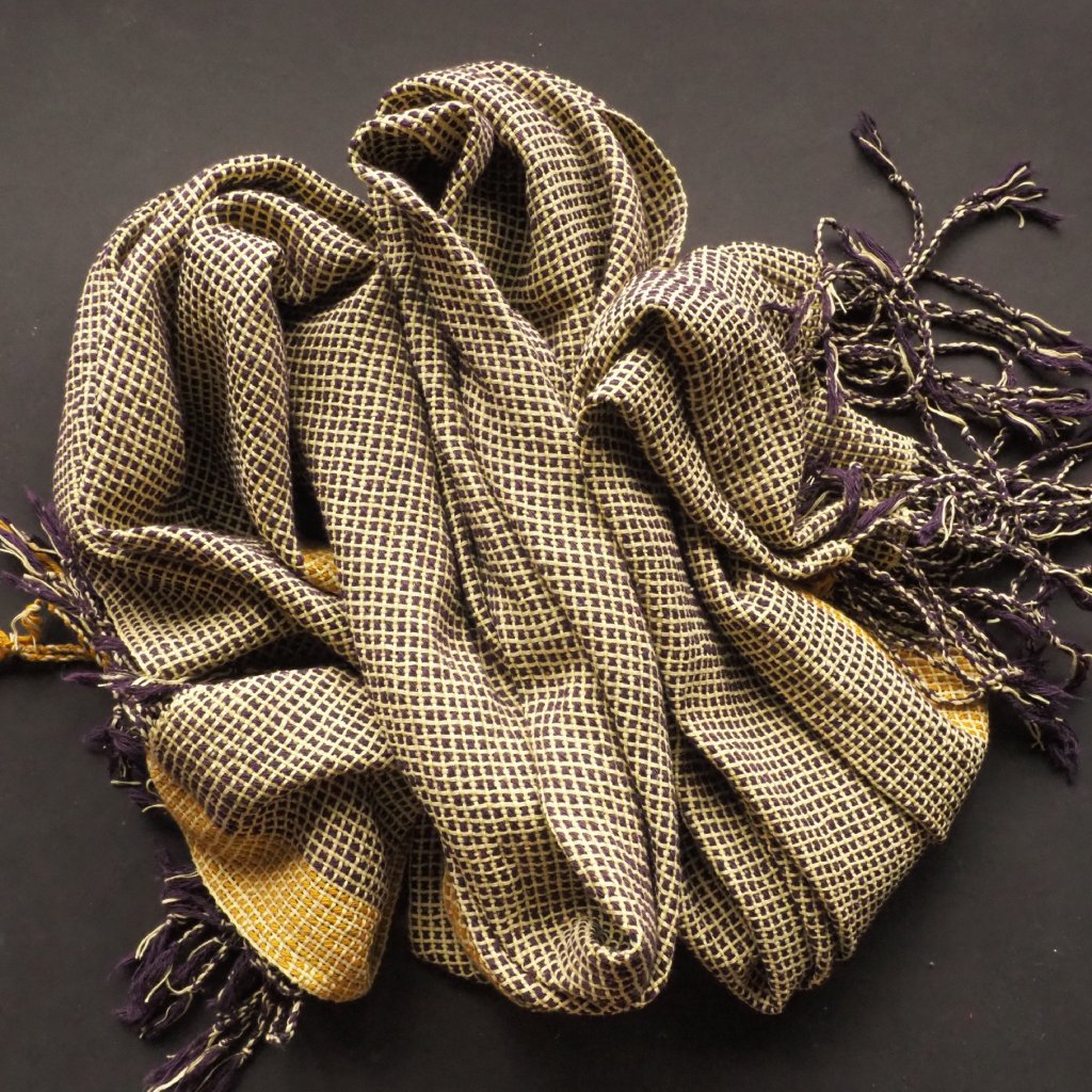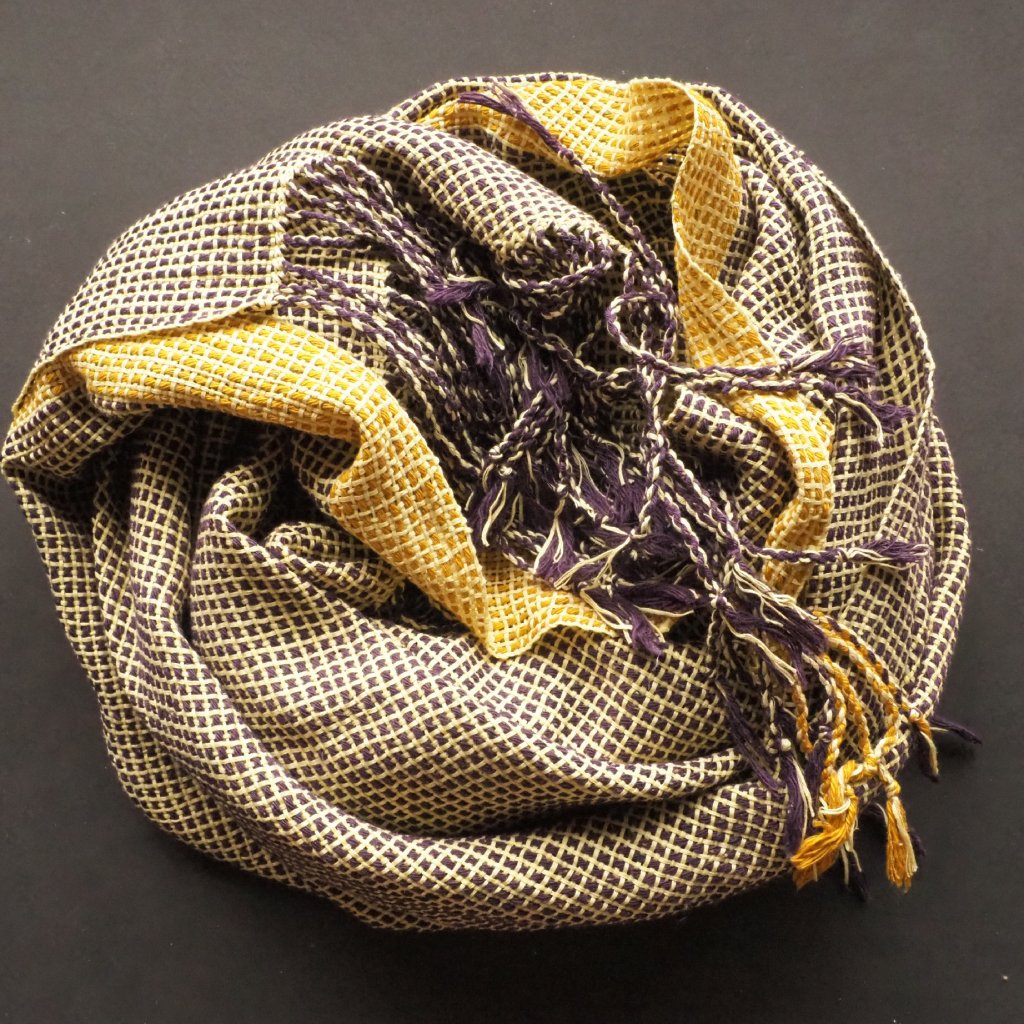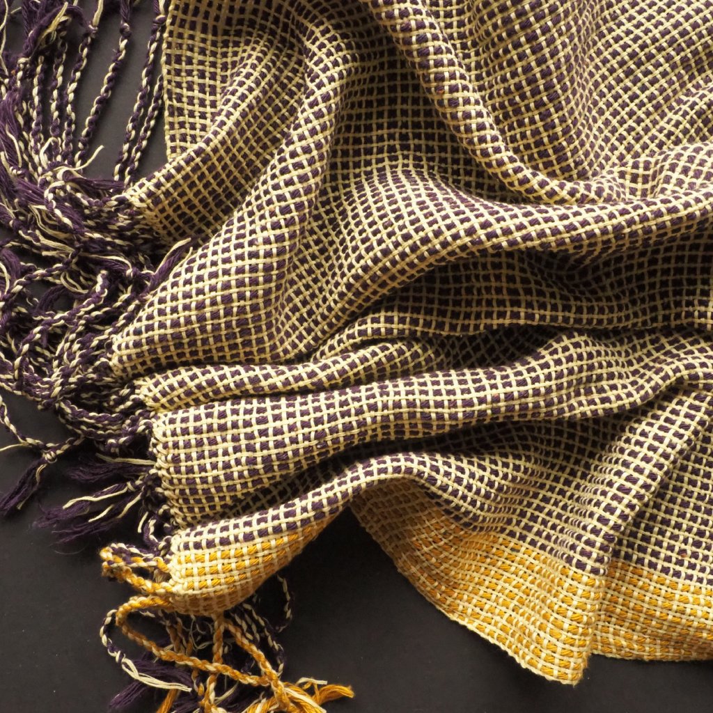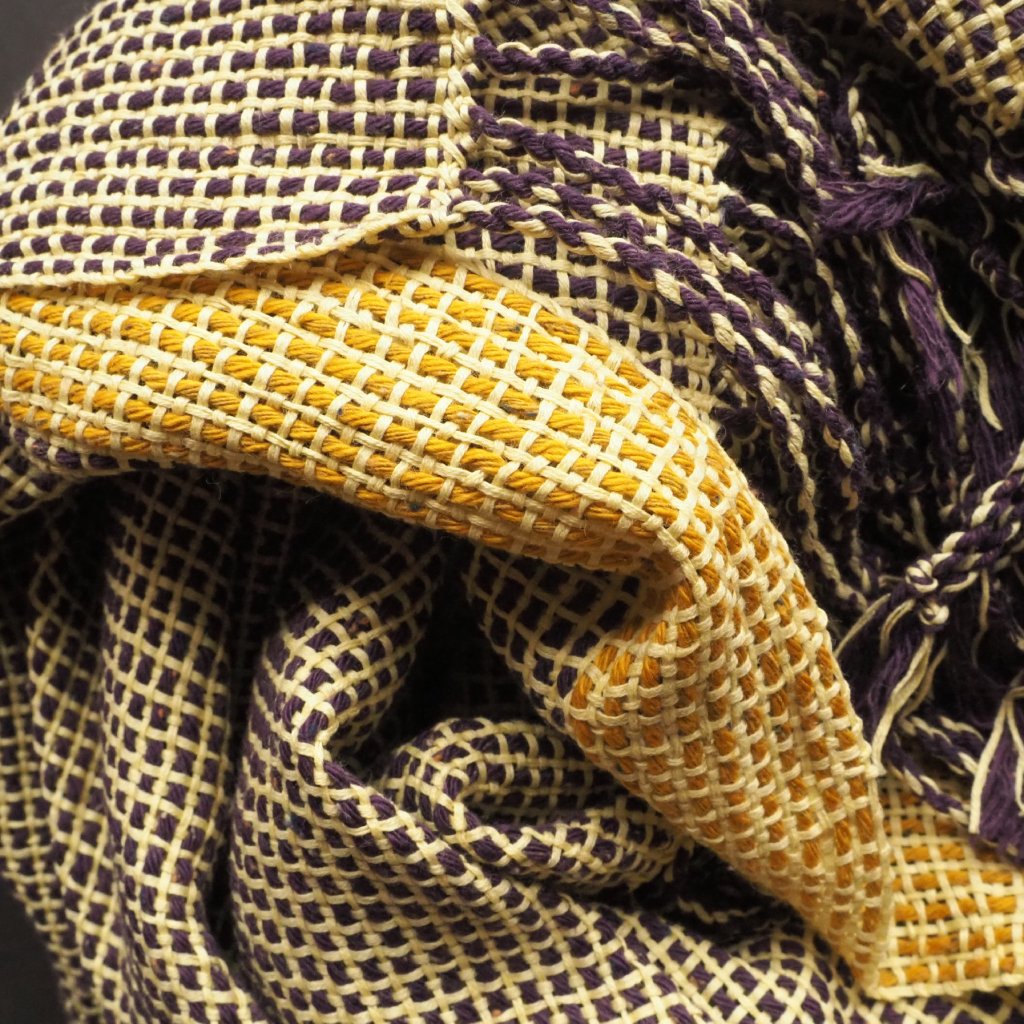 Tlustá a tenká, žlutá a fialová, tradiční a nová. Pléd, která v mém oblíbeném grafickém vzoru kombinuje dvě rozdílné bavlněné příze - tradičně předenou, silnou nopkovou fialovou, a do stužky skanou světle žlutou tenkou. Smířlivější dojem pak celku dává úzký hořčičně žlutý pruh při jednom z podélných okrajů. Celkově je pléd spíše lehčí, a tak jej využijete celoročně. Otužilejším z vás ale poslouží i v zimě.