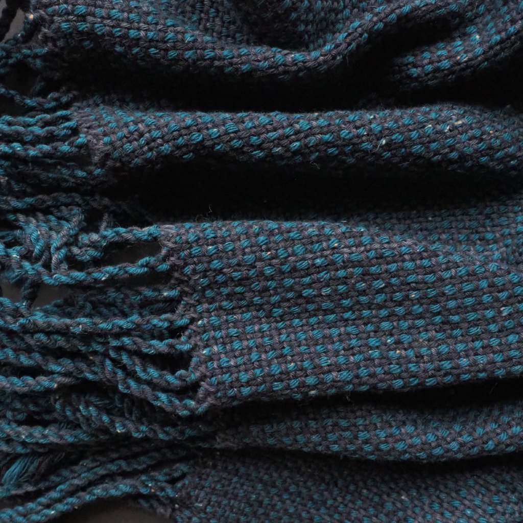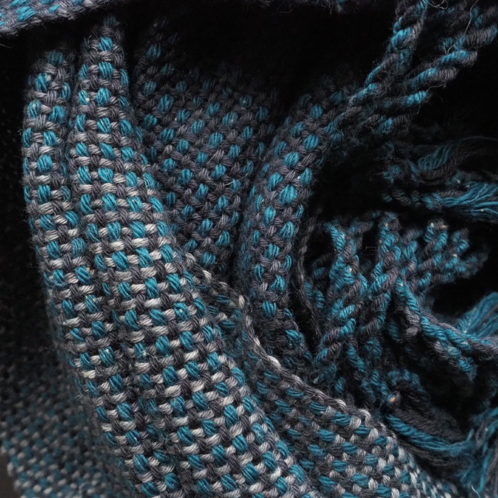 Bavlněný pléd bloumající v tmavé části spektra mezi petrolejovou a odstíny šedé. Kombinuji v něm dvě síly příze, silnější petrolejovou s občasnými nopky, a slabší v odstínech šedé. Celek vytváří drobné kostičky, v útku narušované problesky světlejších šedých, až stříbřitých odstínů. Díky kombinaci dvou sil příze je pléd příjemně členitý na omak a pěkně splývá, je středně lehký až lehčí, a ideální na celoroční používání.