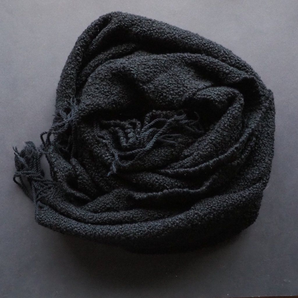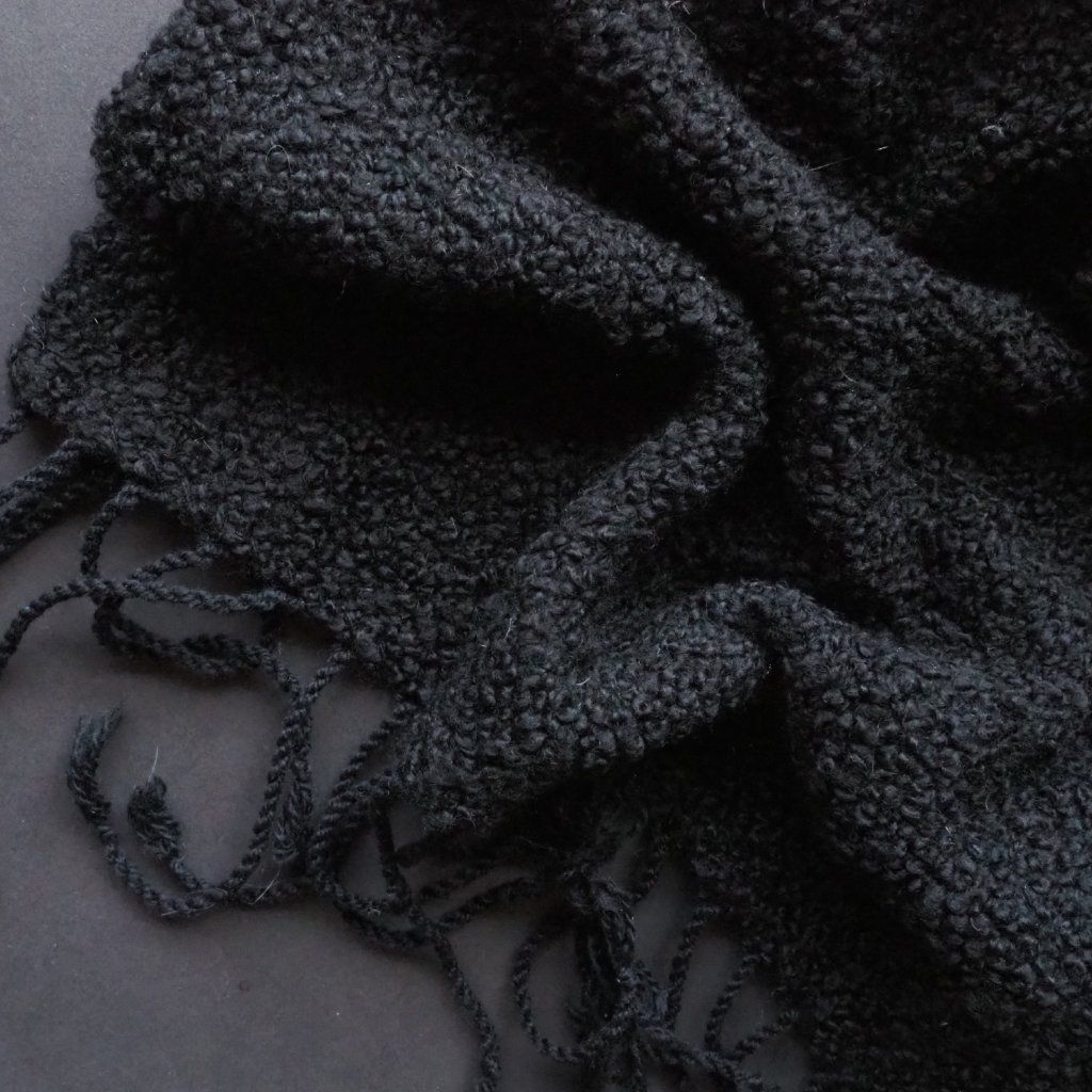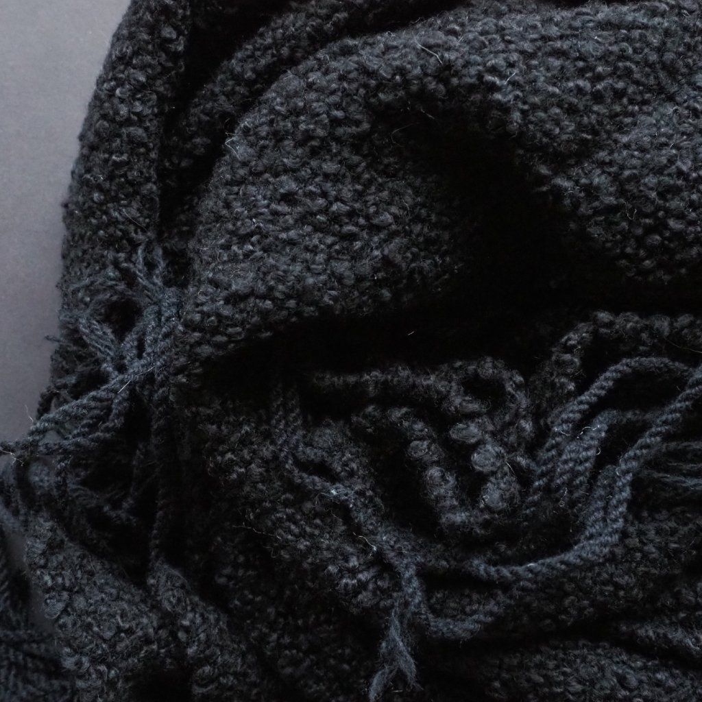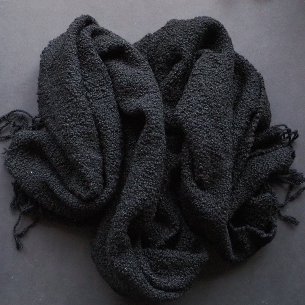 S čistě černou přízí nepracuji příliš často. Když už se k tomu odhodlám, snažím se ji nějak "oživit", nebo musí mít něco navíc. A tohle buklé s kašmírem a špetkou hedvábí to něco mělo na první pohled, a dotek mě v tom jen utvrdil. Je krásně měkké a naducané, hebké a v něčem nostalgické a nadčasové (konkrétní složení je: 56 % merino, 34 % kašmír, 10 % hedvábí). Chtěla jsem, aby v útku vyniklo co nejvíce, a tak jsem hledala osnovu, která jej barevně ani svoji tloušťkou nebude nijak zastiňovat. Vyhrála tenká opět čistě černá směs merina (90 %) a kašmíru (10 %), která je prstýnky buklé natolik zamaskovaná, že z ní v podstatě vidíte jen třásně na koncích plédu. Pléd je spíše silnější, ale na svou tloušťku celkem lehký a nadýchaný. Doporučila bych ho spíše do chladnějších měsíců, ale pokud se v létě chystáte na venkovní koncerty, zahradní slavnosti, či venkovské svatby, budete mu večer vděční za příjemné zahřátí.