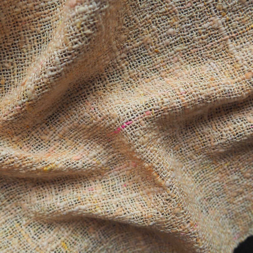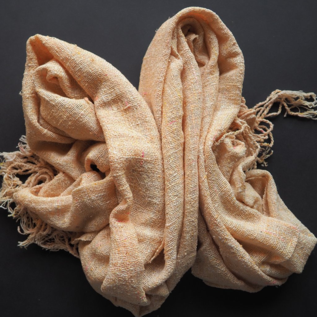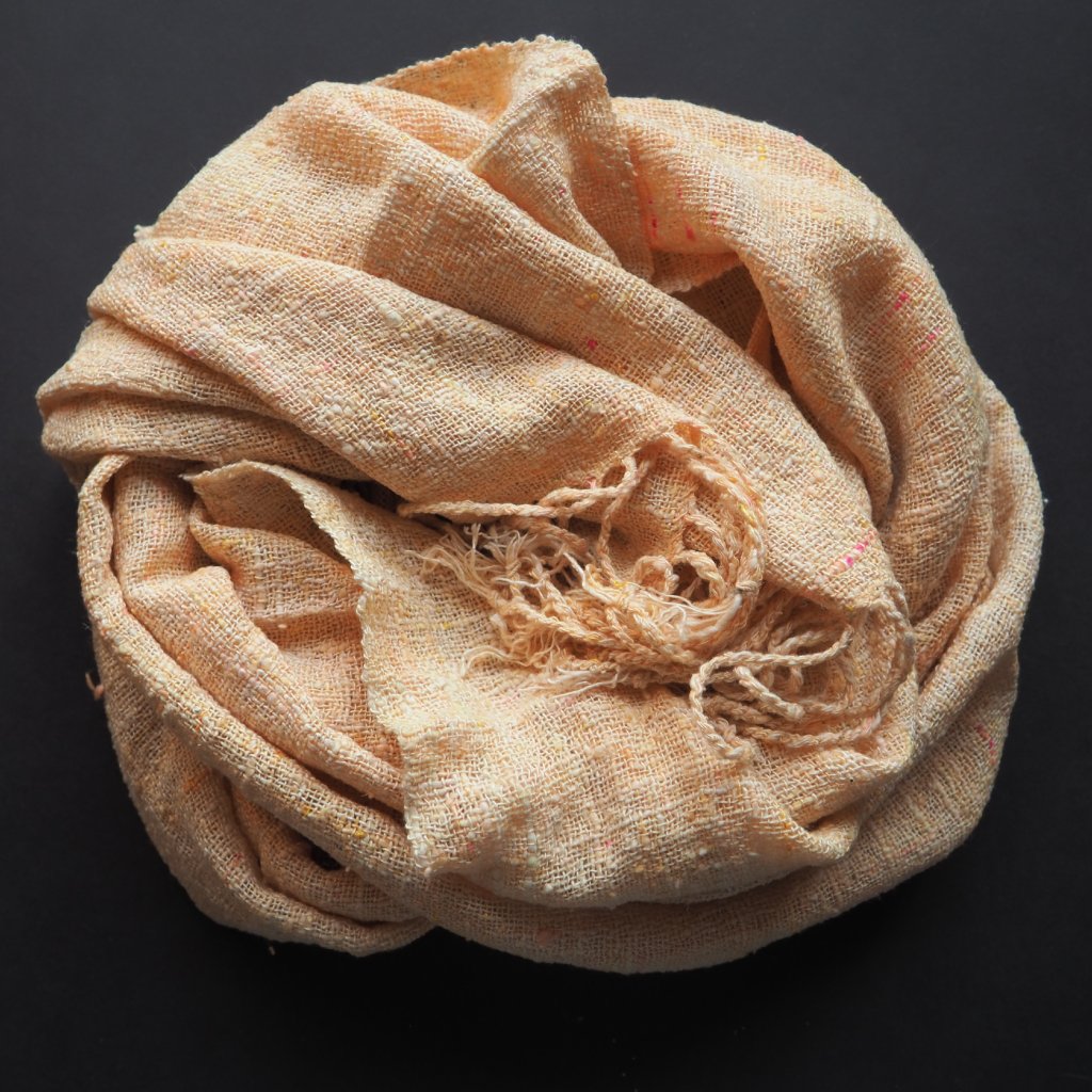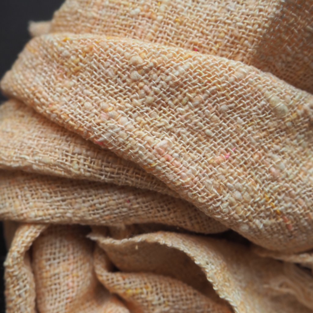 Tenounké hedvábí tussah, s výrazně silnějšími a tenčími místy, které pochází z přebytků italských přádelen. Ještě před tkaním jsem hedvábí obarvila do jemného oranžovo-žluto-růžového odstínu šampaňského, s drobounkými občasnými ostře růžovými detaily. Pléd využijete především v létě, kdy bude chránit před ostrým sluncem, ale otužilejší zahřeje i v chladných měsících.