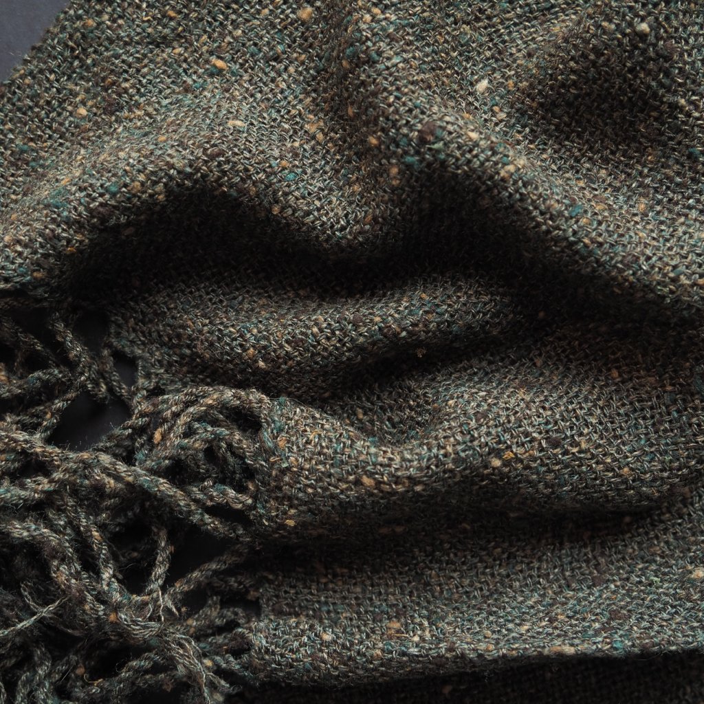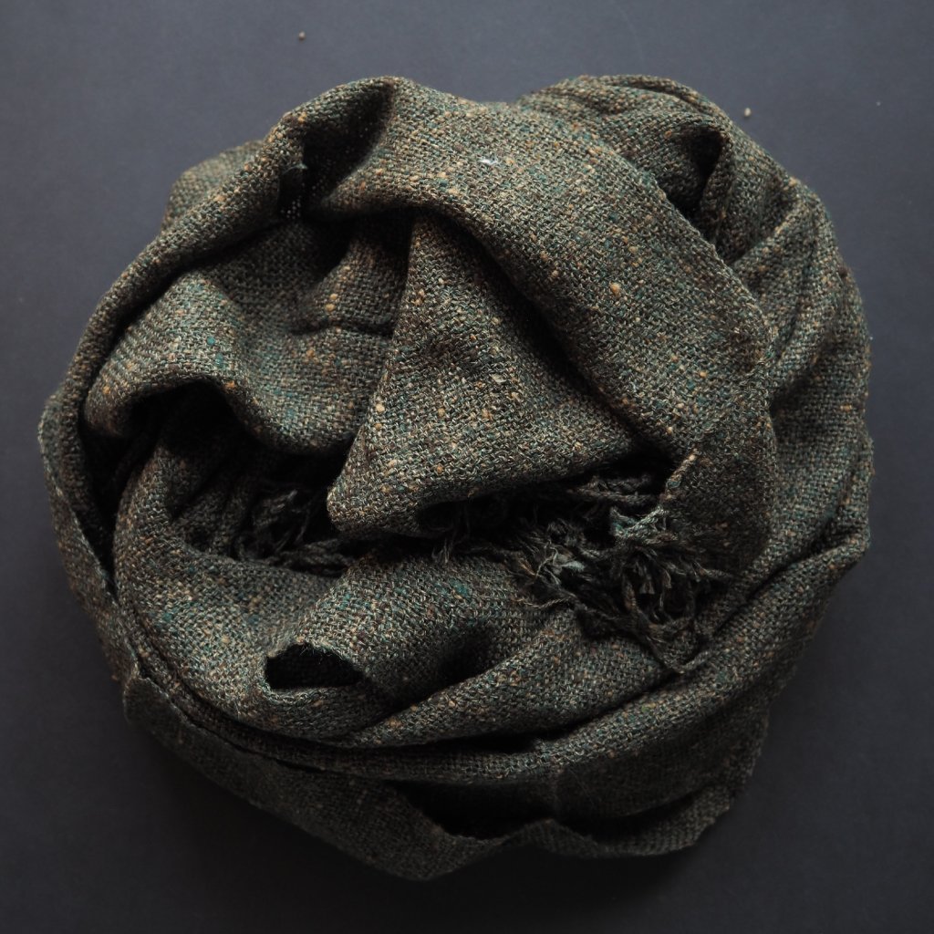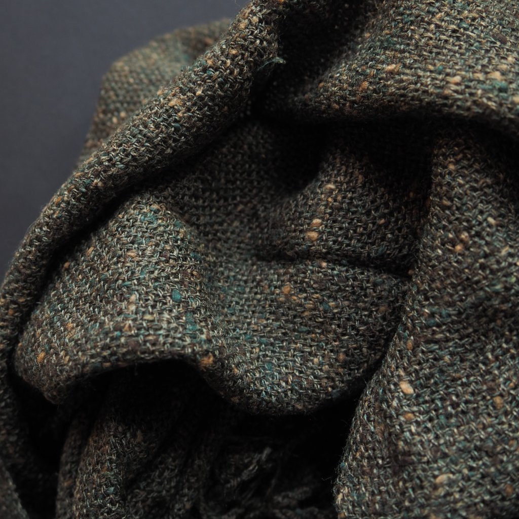 Mé oblíbené buretové hedvábí v nádherné temně zelené až hnědo-zelené, doprovázené nopky v tónech hnědé. Byť to není tradiční neutrální barva, bude myslím díky svému odstínu velmi snadno kombinovatelná. A hedvábí využijete nejen v chladném počasí pro zahřátí, ale i v horkých dnech jako ochranu před žárem. Prostě ideální univerzální kousek na cestování i do kanceláře, do města i do přírody.