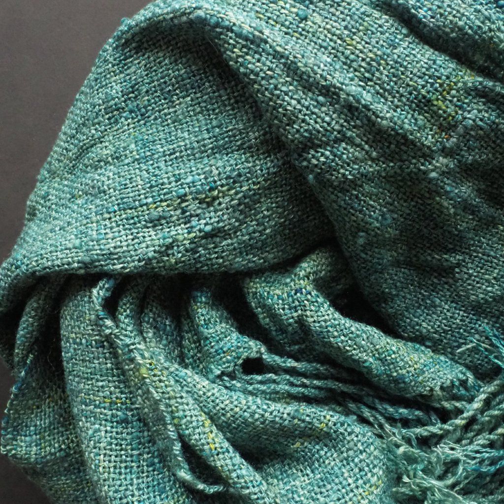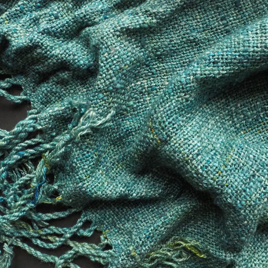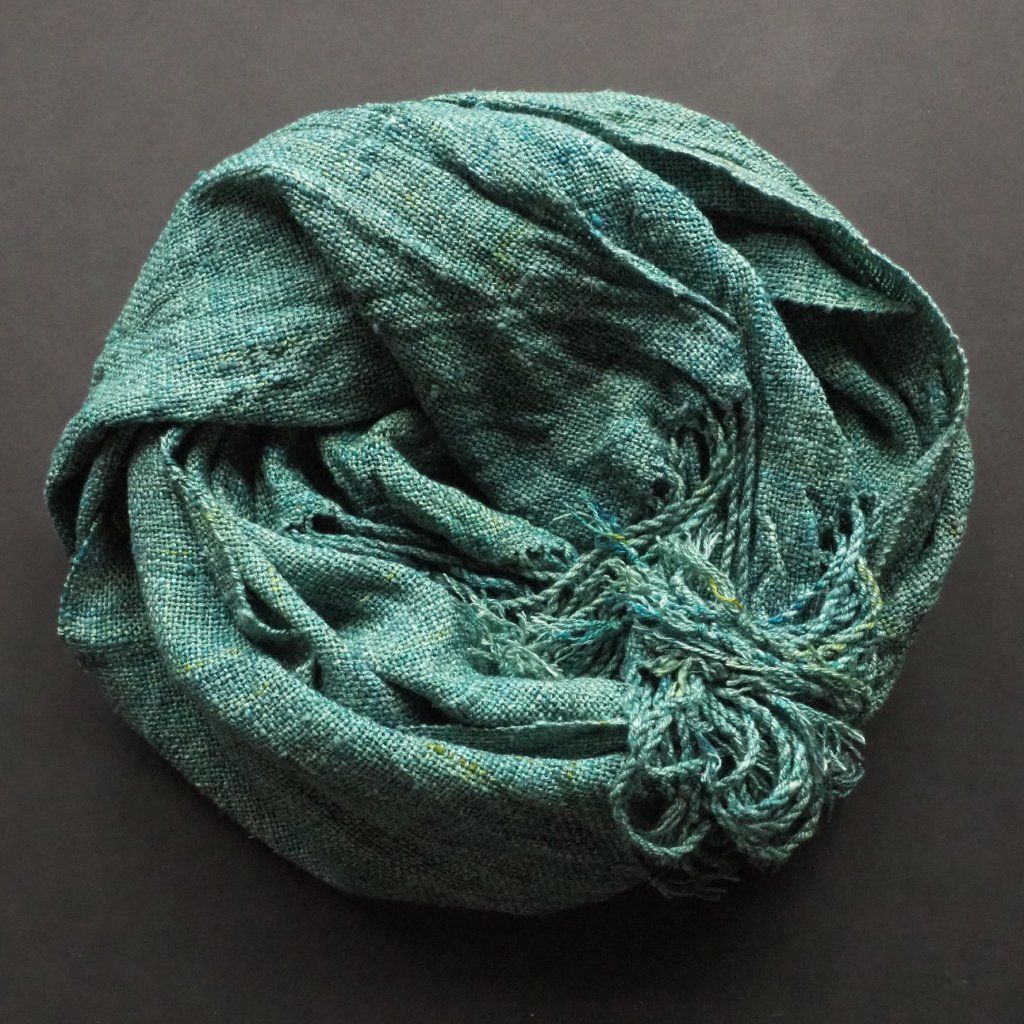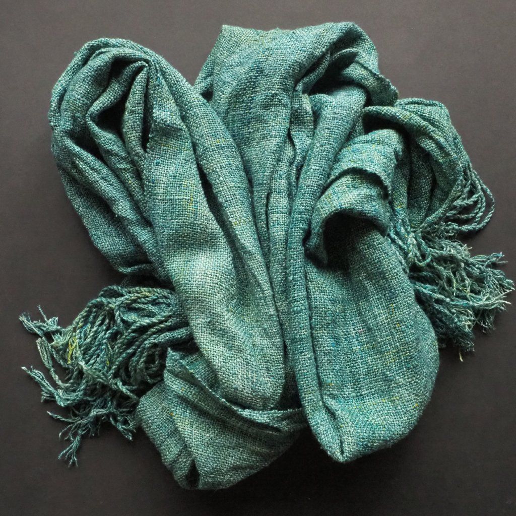 Moje nejoblíbenější hedvábí, tussah. Ještě před tkaním jsem jej obarvila do zelených a modrých tónů. Na omak je jemný a ještě bude nošením měknout. Je lehounký, v létě bude izolovat od tepla a pálivého slunce, v zimě od chladu (i když nezahřeje tolik, jako vlna nebo kašmír).