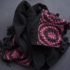 Šála z recyklovaného kašmírového vlákna, černá až na 14 cm široké pruhy s vytkávaným vzorem na každém konci. Recyklované vlákno je trochu hrubší než nový kašmír, a má o poznání méně jemných krátkých chloupků, které vytvářejí specifické halo. Je také trochu tvrdší, ale nošením a občasným praním postupně krásně změkne. Hlavní tkanina je v plátnové vazbě, v bordurách je přidán vytkávaný vzor (stále zpěvněný černou plátnovou vazbou) ve světle vínové silnější přízi. Šála je trochu užší, ale stále je vhodná i k přehození kolem ramen, nejen k omotání kolem krku. Při prvním zmíněném stylingu můžete dát krásně vyniknout vytkávanému ozvláštnění.