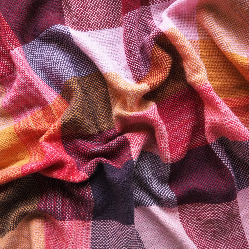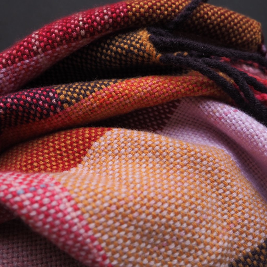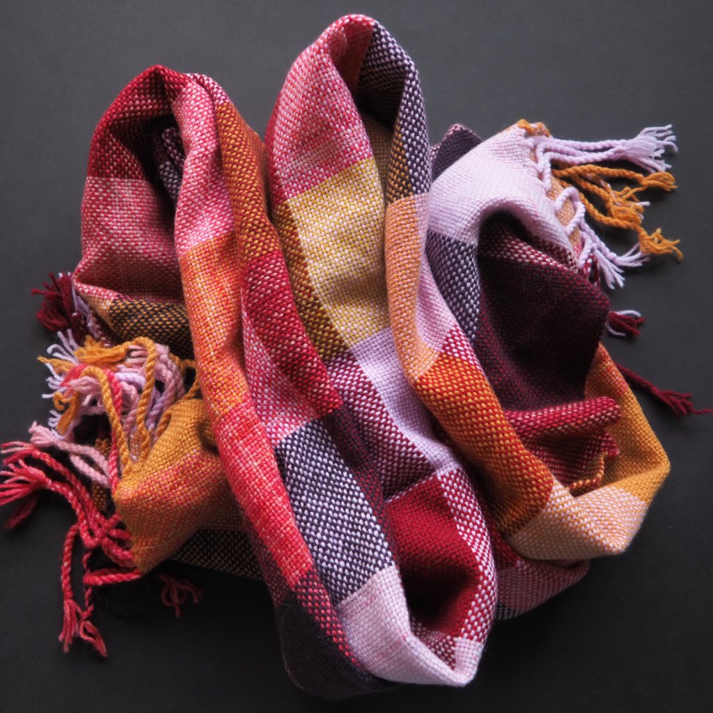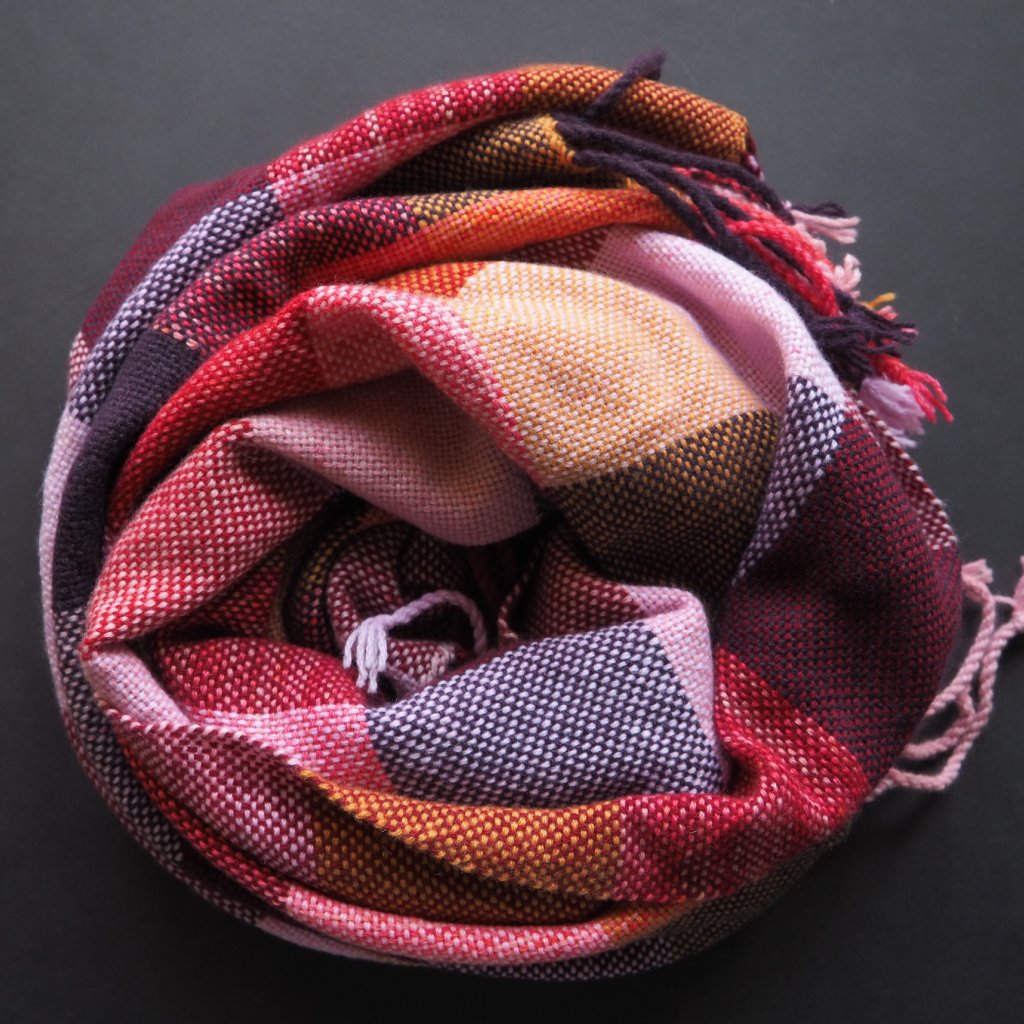 Pléd z kašmírové příze z přebytků z italských přádelen jsem utkala v pravidelných kostkách v odstínech růžové, červené, vínové, fialové a hořčičně žluté. Některé z odstínů jsem již získala nabarvené, některé sama dobarvila ručně. Výsledkem je rozzářený pravidelně-nepravidelný kousek, který zahřeje nejen na dotek, ale i od pohledu. Je ze stejné příze jako můj vlastní celoroční pléd, jen o trochu užší. A tak se jej ani vám nebojím doporučit jako vytrvalého parťáka na běžné i slavnostní nošení.