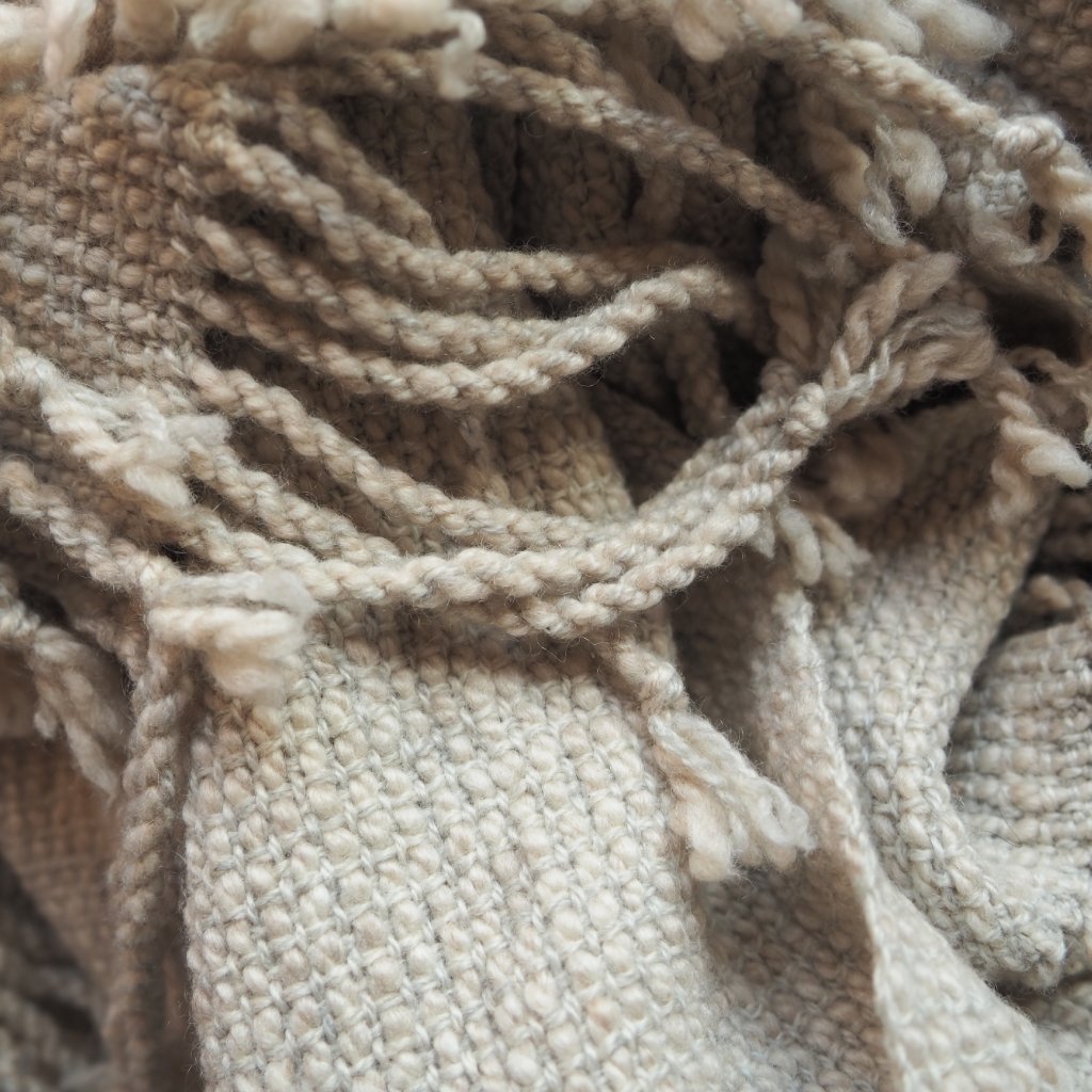 Kombinace dvou silou odlišných kašmírových přízí, v drobounkých plastických kostičkách. Vedle velkého kontrastu v tloušťce je tu i miniaturní rozdíl v barvách - silnější teple světlounce béžová je kombinovaná s tenkou perleťově šedou. Celkově šála působí jako téměř krémová, teple neutrální. Na první pohled je nenápadná, při bližším zkoumání rafinovaná a plastická. Pléd je středně silný, ale díky konstrukci plátnové vazby a kašmírovým přízím krásně nadýchaný.