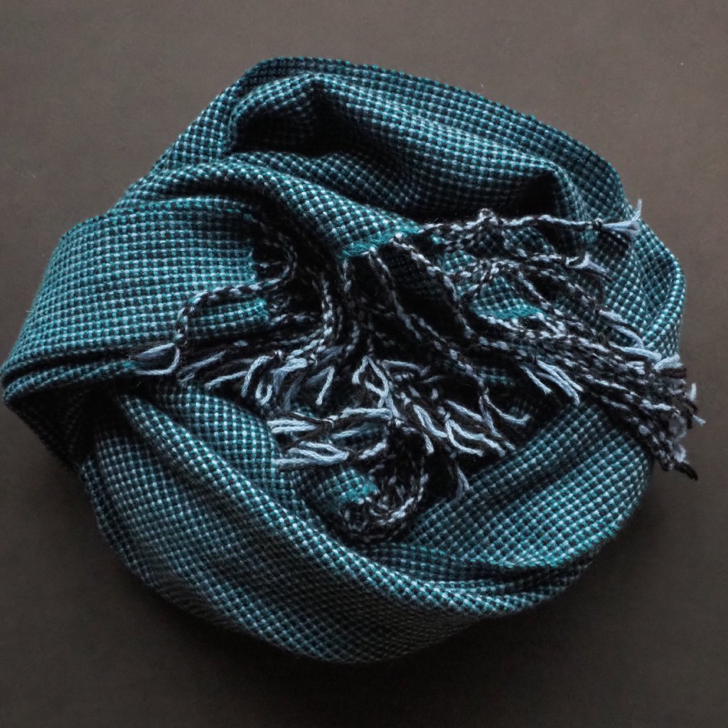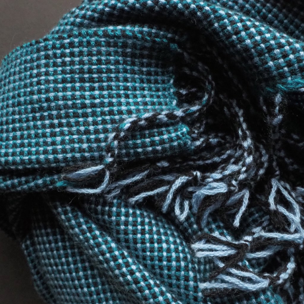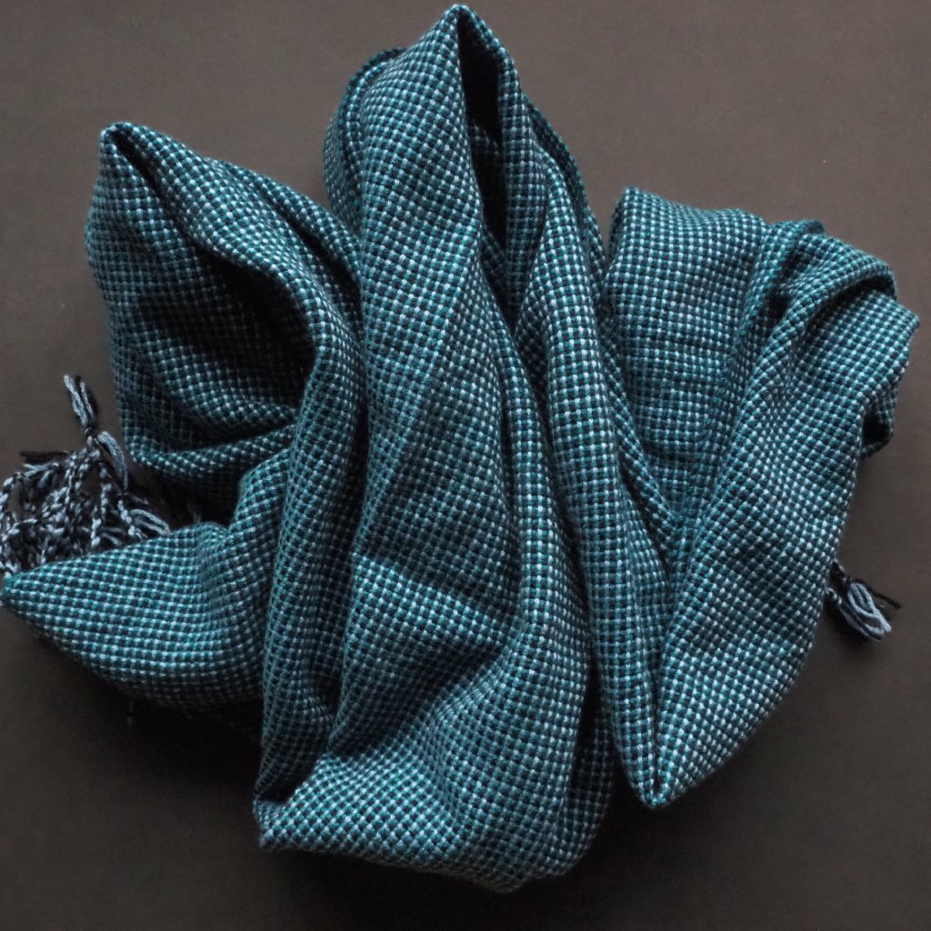 Pléd z čistého kašmíru kombinující černou, světle modrou a tmavě tyrkysovou tak, aby vytvářel drobounký, zdánlivě až trojrozměrný kostičkový efekt. Sloužit bude celoročně, v zimě zachumlaný ke krku a v létě přehozený přes ramena. Je ze stejného kašmíru jako můj už léta nošený tmavěmodrý pléd, a tak mohu slíbit, že při správné péči bude i příští dekádu vypadat jako nový.