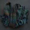 Tenký pléd a tmavě petrolejovou strojovou přízí v osnově (70 % merino, 30 % kašmír), a mnou upředenou čistou merino přízí v útku. Předla jsem tak, aby se jednotlivé barvy v plédu střídaly v nepravidelných různě širokých pruzích, a pokud možno mezi sebou přecházely pozvolna a neostře. Pohybují se přitom mezi tmavě petrolejovou, světlejší tyrkysovou, sytě cihlově oranžovou, modrou a zelenou. Svou nepravidelností pak ruční příze dodává plédu zajímavý vzhled, díky konstrukci z jedné nitky mu dává jemnost a měkkost.
