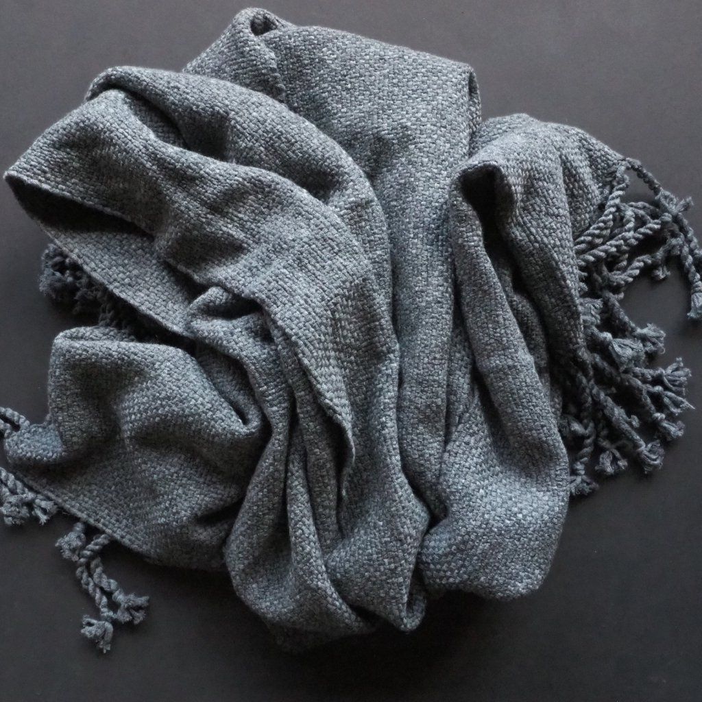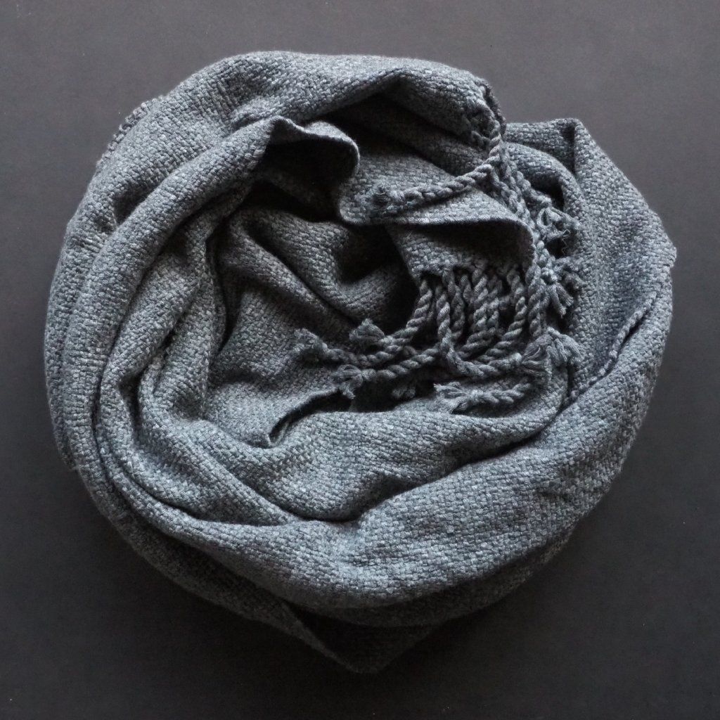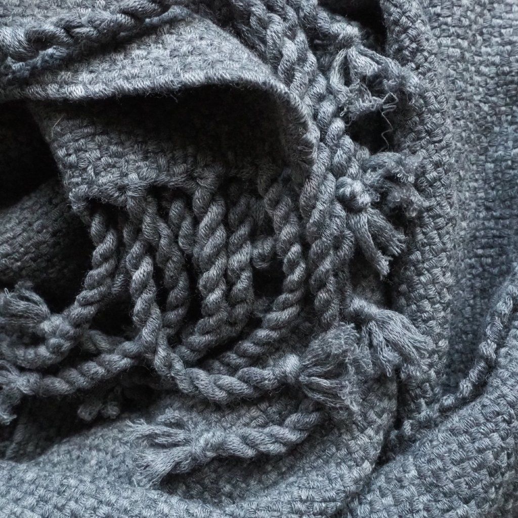 Příze - nepříze. Někde na začátku její struktury totiž je tenounká upředená nit, ale ta byla strojově upletená do trubičky, místo aby byla skaná a sdružovaná do silnějšího celku. A právě toto zpracování jí dává zajímavé vlastnosti - je "placatá", v podstatě jako stužka, takže i tkanina z ní je plochá, ale přitom má výraznou strukturu jednotlivých vazných bodů, a pletený povrch odráží světlo jednotněji, než by činila čistě předená příze, a tak se jemně leskne. Hotová tkanina zároveň splývá a je příjemně těžká a na omak chladivá (i když na krku bude krásně hřát). Příze už mi do rukou přišla nabarvená ve středně šedém melíru, který dává výsledku hloubku a zajímavost. Kousek je spíše silnější a hřejivější, ale zimomřivější jej využijí i v teplejší měsících.