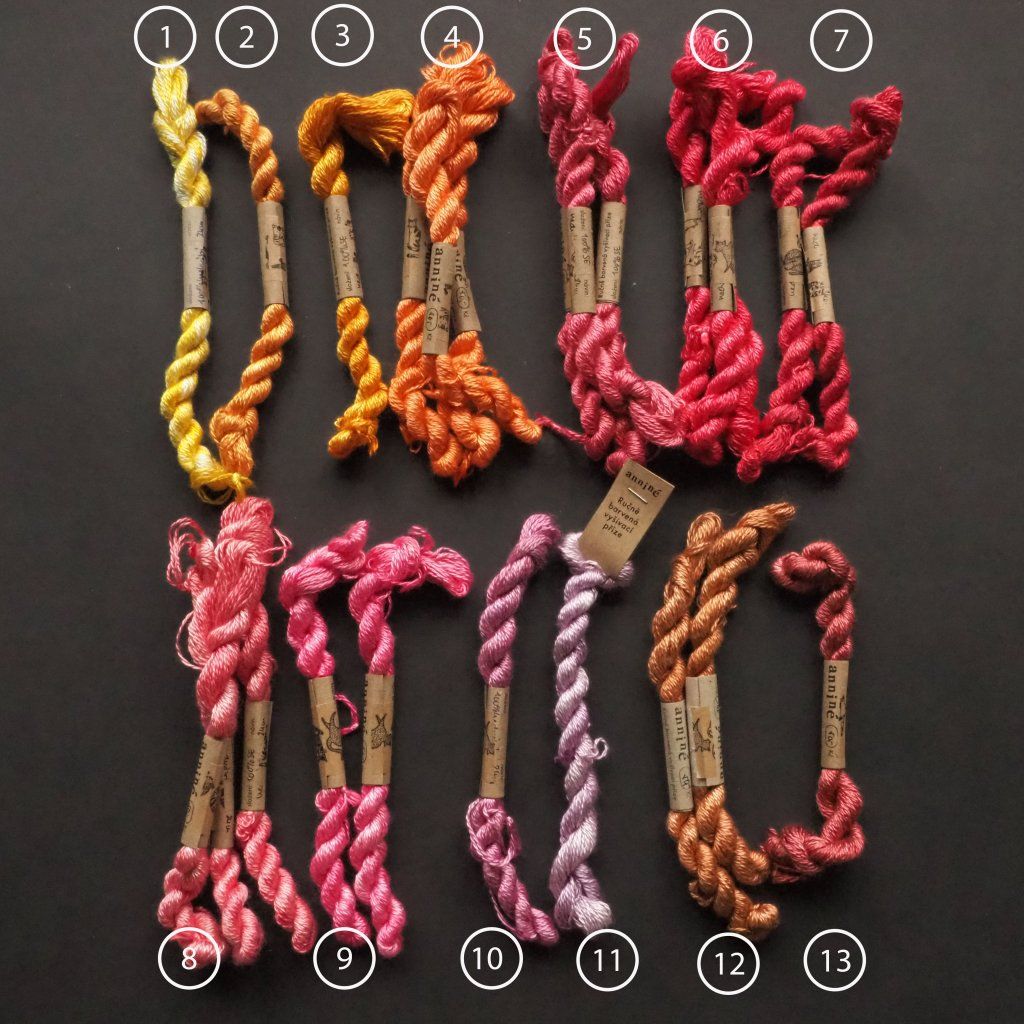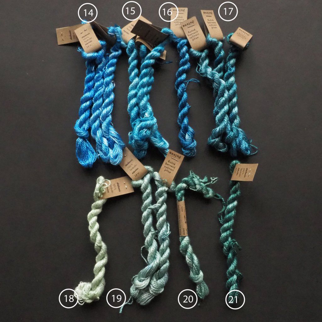 Silou příze odpovídají přibližně bavlněné perlovce nebo třem nitkám mulinky, ale oproti nim jsou ve výšivce nadýchanější. Výborně vypadají nejen v křížkové výšivce, ale i při běžném vyšívání různými typy stehů - krásně lesklé a nadýchané budou například francouzské uzlíky. Díky postupům ručního barvení není barva příze jednolitá, ale melírovaná tón v tónu, což dodává výšivce živost a realističnost. Některé příze barvím pestřeji jako vícebarevné. Příze barvím ručně v malých sériích, a nemohu zaručit, že barvy budu schopná v budoucnosti přesně zopakovat, proto doporučuji koupit dostatečné množství příze na plánovaný projekt.