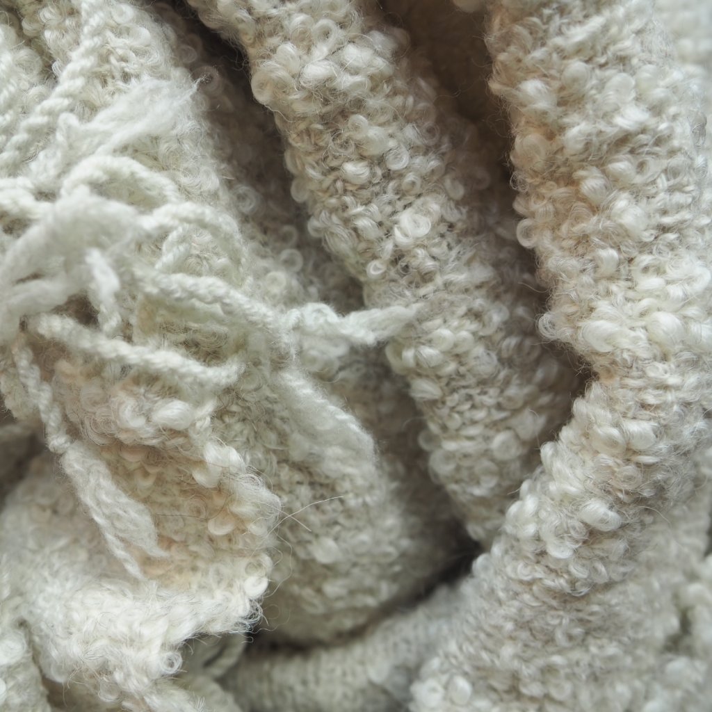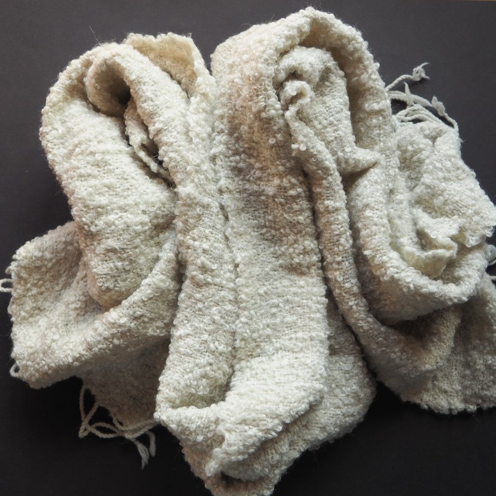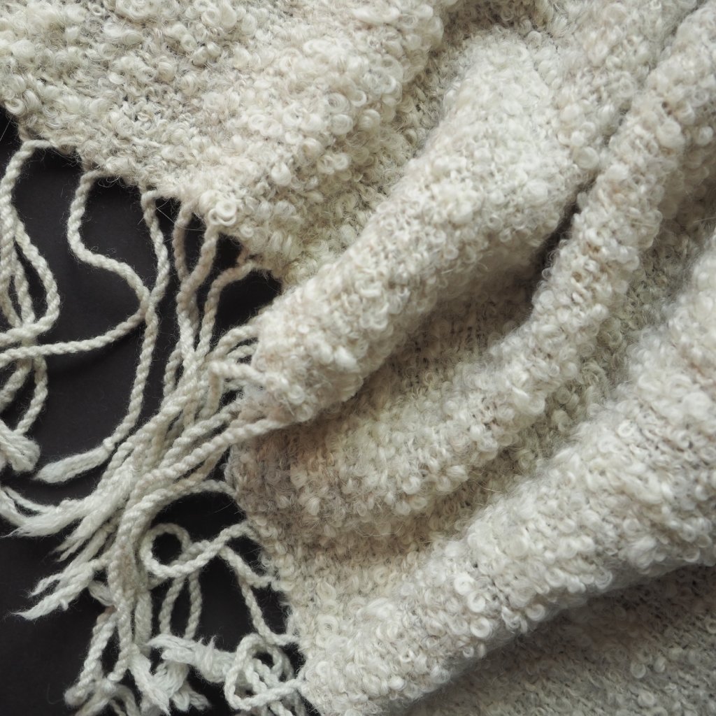 U efektních přízí, které často nelze na stavech se kterými tkám využít jinde než v útku, si vždycky lámu hlavu nad tím, do jaké je zatkat osnovy. Osnova je nesmí přebít ani barevně ani silou, má jen poskytnout oporu a nechat vyniknout struktuře, barvě, efektu. Tady to bylo lehké. Jen co jsem tuhle buklé přízi viděla, bylo mi jasné, jakou bude mít osnovu - barevně blízkou, perleťově šedou, silnou tak akorát. A byť jsem před praním byla ještě napjatá, výsledná tkanina je nad má očekávání jednolitá, a správně bublavá. Osnova je směs merina (70 %) a kašmíru (30 %), buklé útek z vláken lamy alpaky (87 %) a bavlny (13 %). Výsledek je sice silná a objemná, ale relativně lehká šála, která zachumlá, ozdobí a bude hýčkat. A pokud je pro vás příliš minimalistická, zůstaňte na příjmu - budou i barvy.