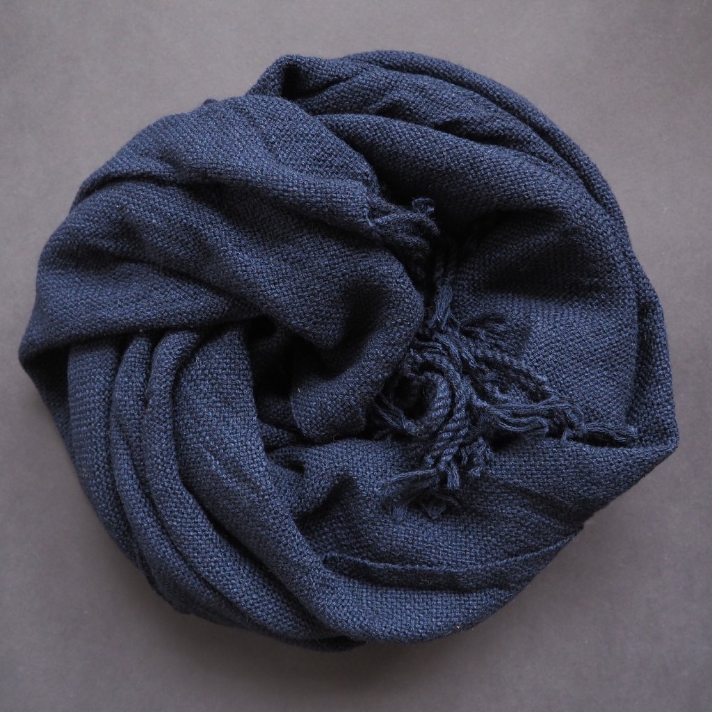 Co se struktury příze týče, jsem trochu podezřívavá. Nediskriminuji, mám ráda přízi mykanou i česanou (mykanou možná trochu víc), různě zakroucenou a různě skanou. Ale když mám před sebou vlákna nafoukaná do síťové trubičky, nebo jednonitku která byla do silnější podoby upletena a ne seskána, zbystřím, a moje první reakce je odmítavá. Sice jsem opakovaně ověřila, že takové zpracování dává přízím vlastnosti, kterých se běžným předením jen těžko dociluje, ale pořád mi na nich něco nesedí. Téhle přízi, byť je pletená, ale nešlo odolat. Pro nádherně temnou modrou barvu, pro jemný hedvábný lesk. A byť jsem se ještě při tkaní obávala výsledku, jsem s ním nakonec moc spokojená, a možná ty novoty nakonec vezmu na milost. Díky její struktuře totiž vznikla jedinečně splývavá tkanina. Materiálově se jedná o směs merina (40 %), hedvábí (35 %) a kašmíru (25 %), pléd je to spíše tenčí, ale díky hřejivým materiálům na celoroční nošení. Nemluvě o tom, jak by krásně dozdobil večerní či koktejlové šaty, a nebo pánský temně modrý oblek.