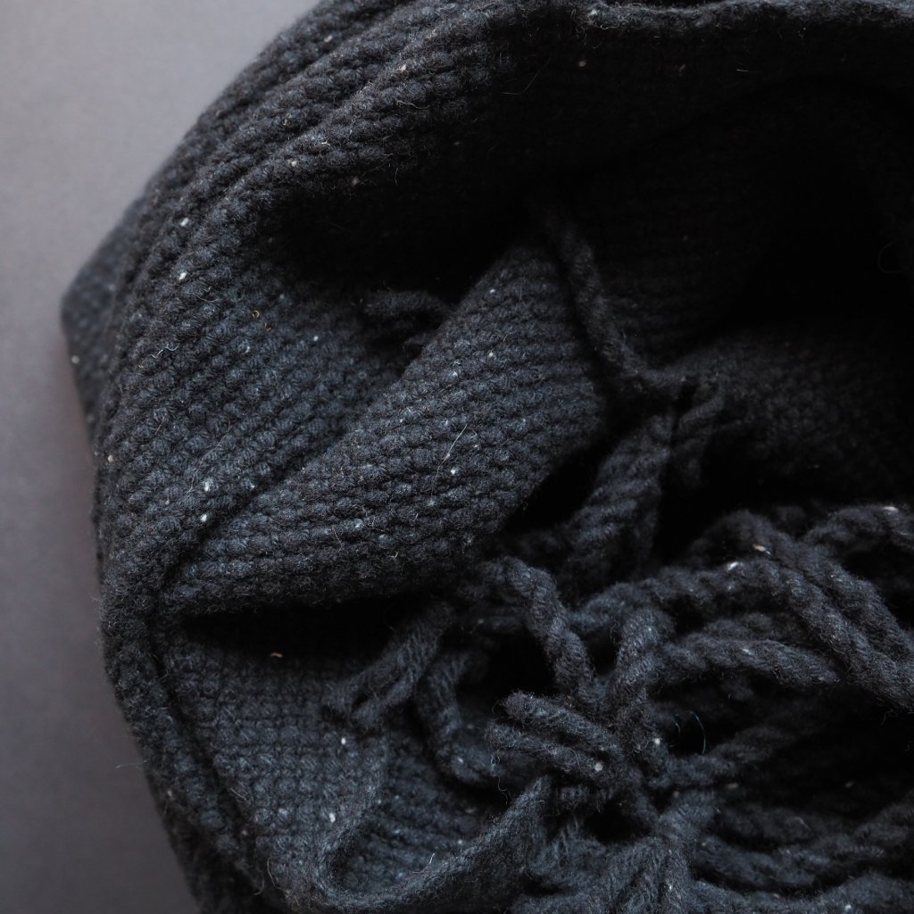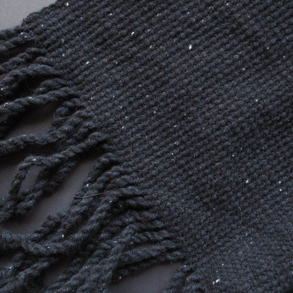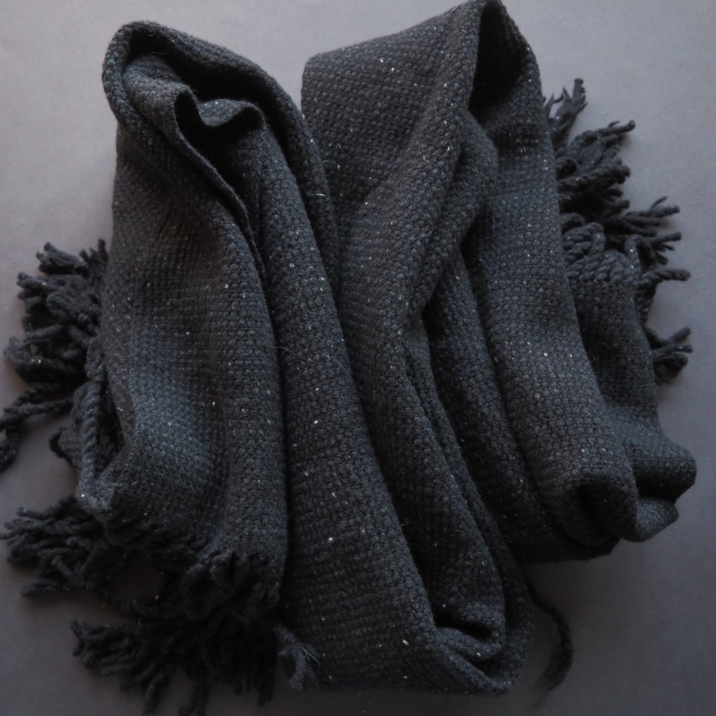 S čistě černou netkám často. Vím, že po ní bývá sháňka, ale přijde mi, že v hladké čistě černé přízi se tak nějak ztrácí ruční zpracování, utkaný kousek začíná být podobný průmyslově vyrobeným šálám, a to mi přijde škoda. A tak když černá, musí mít ještě něco navíc. Tady jsem vzala svou oblíbenou řízeně zaplstěnou silnou černou merino přízi s drobnými světlými nopečky (už mi rukama prošly asi 3 kila této příze z přebytků, vedle pár šál jsem ji použila i na svoje dva pletené svetry). A abych celek výsledné šály odlehčila, a zároveň vytvořila zajímavou povrchovou strukturu, prostřídala jsem ji v osnově s o poznání tenčí směsí merina (70 %) a kašmíru (30 %), a v útku obě setkala jen touto tenčí přízí. Výsledek je středně silná šála se dvěma druhy černé a občasným drobounkým bílým nopkem. Takže černá, ale vlastně nečerná, a rozhodně není zaměnitelná s tuctovým průmyslovým výrobkem.