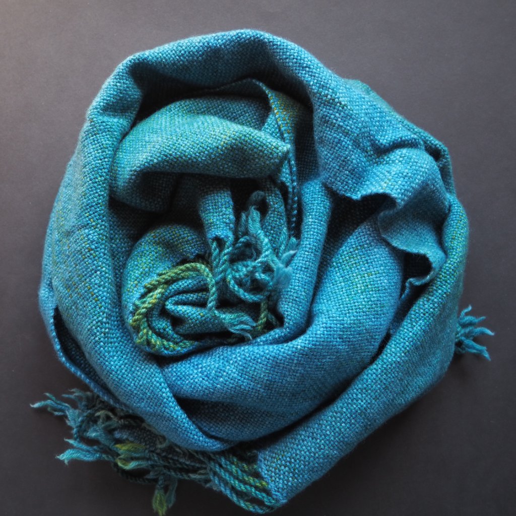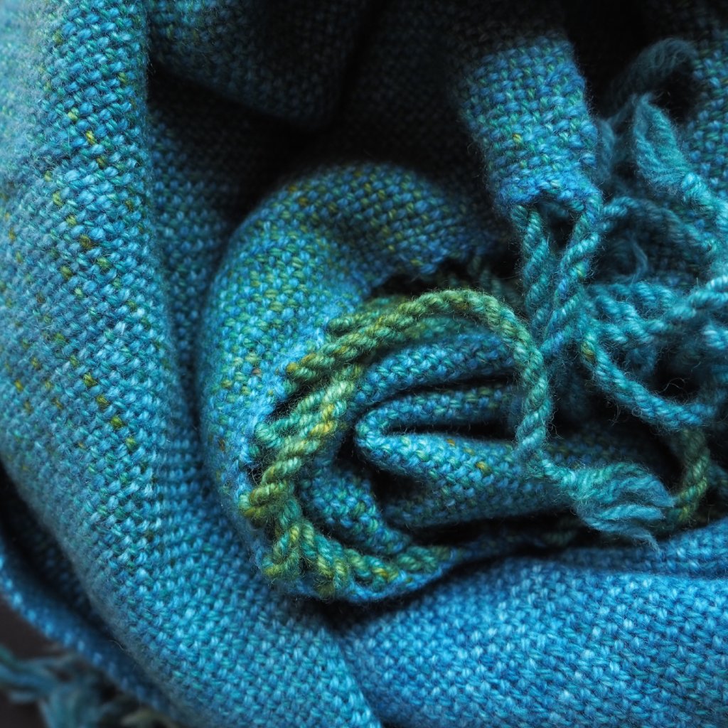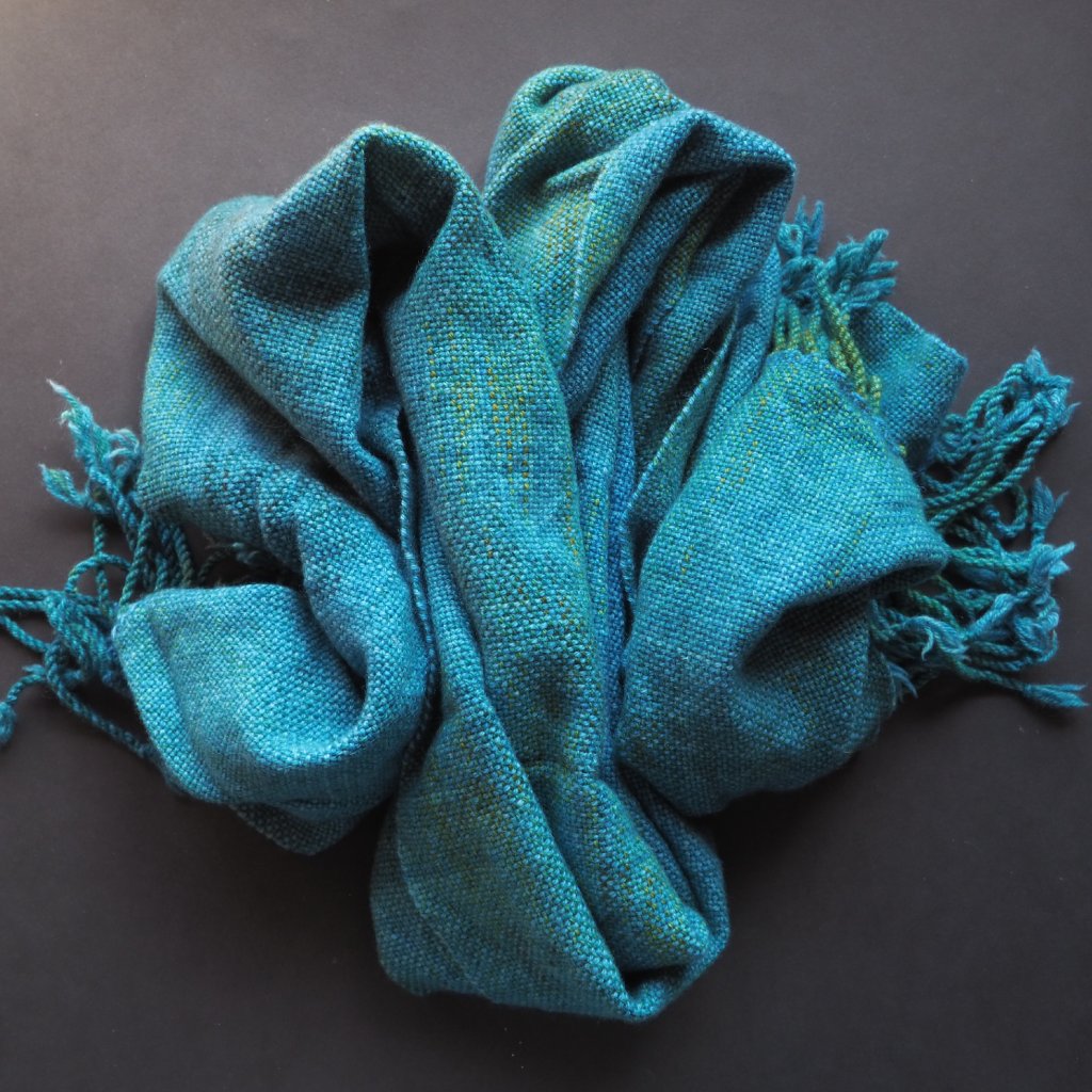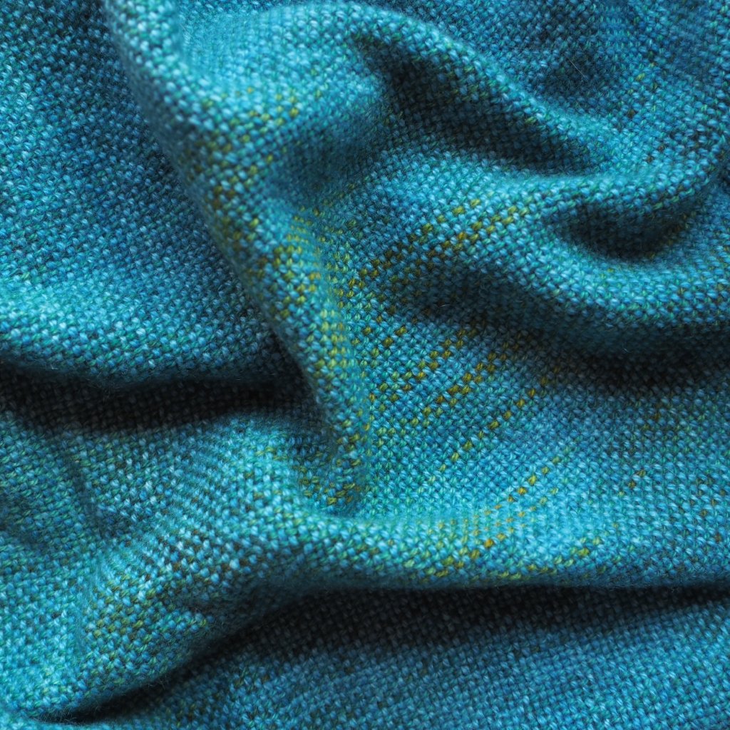 Středně tenký pléd ze směsi merina (90 %) a kašmíru (10 %) pocházející z přebytků italských přádelen jsem před tkaním barvila na tmavě tyrkysové odstíny, s tmavě zelenými momenty a občasným žlutým okrovým detailem. Pléd je díky obsahu kašmíru krásně nadýchaný a na svou sílu a hřejivost lehký, a v použití velmi univerzální.