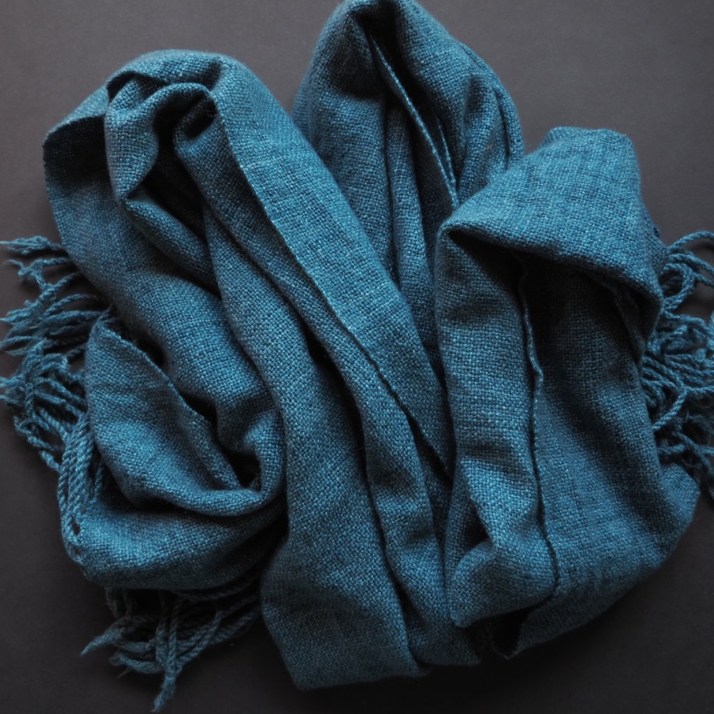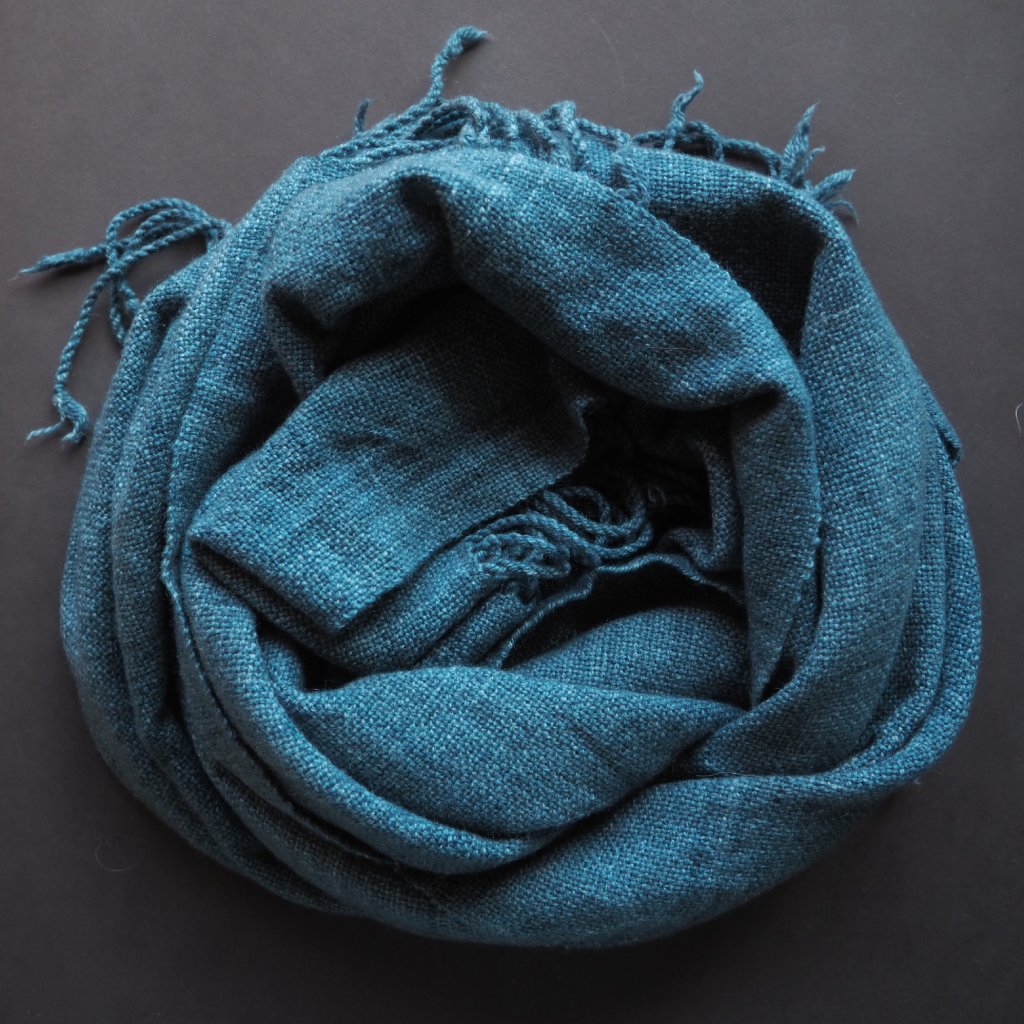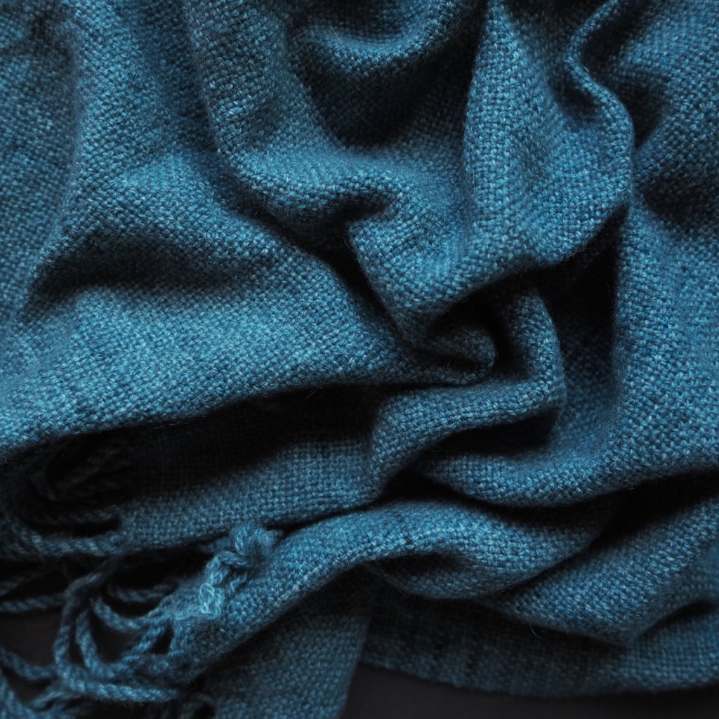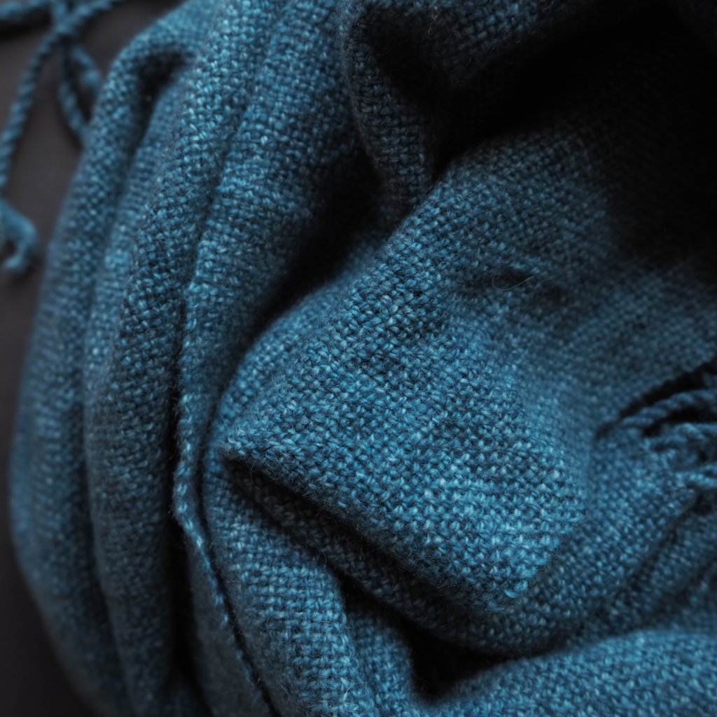 Spíše tenčí pléd ze směsi merina (70 %) a kašmíru (30 %) jsem před tkaním barvila na hluboký tmavě modrý, až petrolejový odstín. Nepravidelnosti ručního barvení v přadenech vytvářejí v hotové tkanině melírovaná křížení a ještě prohlubují barevný vjem. Pléd je díky obsahu kašmíru krásně nadýchaný a na to jak je tenký bude díky kašmíru krásně hřát. Zimomřivější jej využijí i v létě, otužilejší i v zimě. Je to skvělý parťák na cestování a do klimatizovaných prostor.