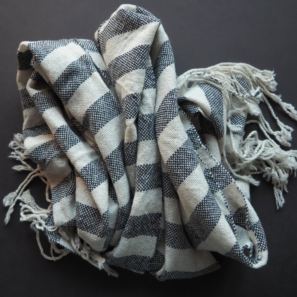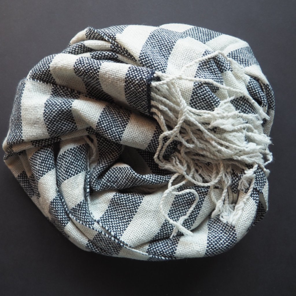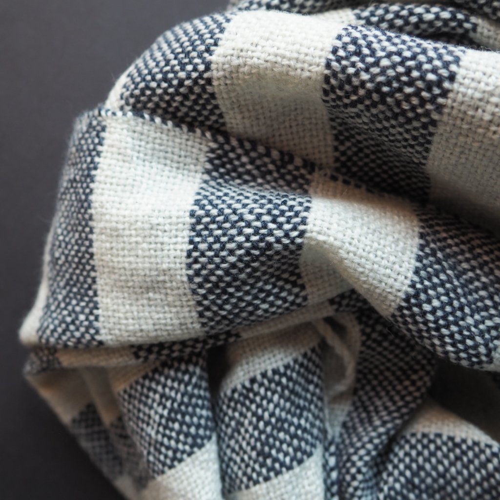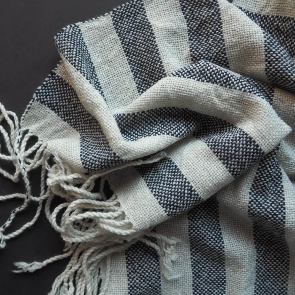 I malé množství kašmíru dodá vlněné přízi hebkost a nadýchanost - a tahle šála je toho důkazem. Kašmíru je tu 30%, ostatní vlákna v přízi jsou z ovcí plemene merino. Příze pochází z přebytků italských přádelen. Do osnovy jsem použila jemně krémově-šedou přízi, v útku ji zopakovala prostřídala s temně modrou v přibližně 3 cm úzkých pruzích. Pléd je spíše lehčí, využijete jej celoročně.