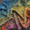 Pro tento pléd jsem ještě před tkaním barvila přízi v menších přadenech a tak, aby mezi sebou barevně přecházela. Na jedné straně byla modrá, na druhé červená, a mezi ně vklíněná žlutá, a mezi sebou si tyto barvy "povídaly" v melírech, flecích a sekundárních barvách. Ve stejném pořadí jako jsem barvila přadýnka jsem je pak i umístila ve stejně širokých pruzích do osnovy a do útku, a možnosti dialogu barev se pomnožily. Zatímco v jednom rohu plédu se soustředí červená, druhý se modro-červenou kombinací vybarvuje do fialova, a prostředek se intenzivně žlutí. Příze pochází z přebytků italských přádelen a pletáren a je z čisté ovčí vlny plemene merino. Má jemný lesk a je těžce splývavá, je tenčí a vhodná pro celoroční nošení.