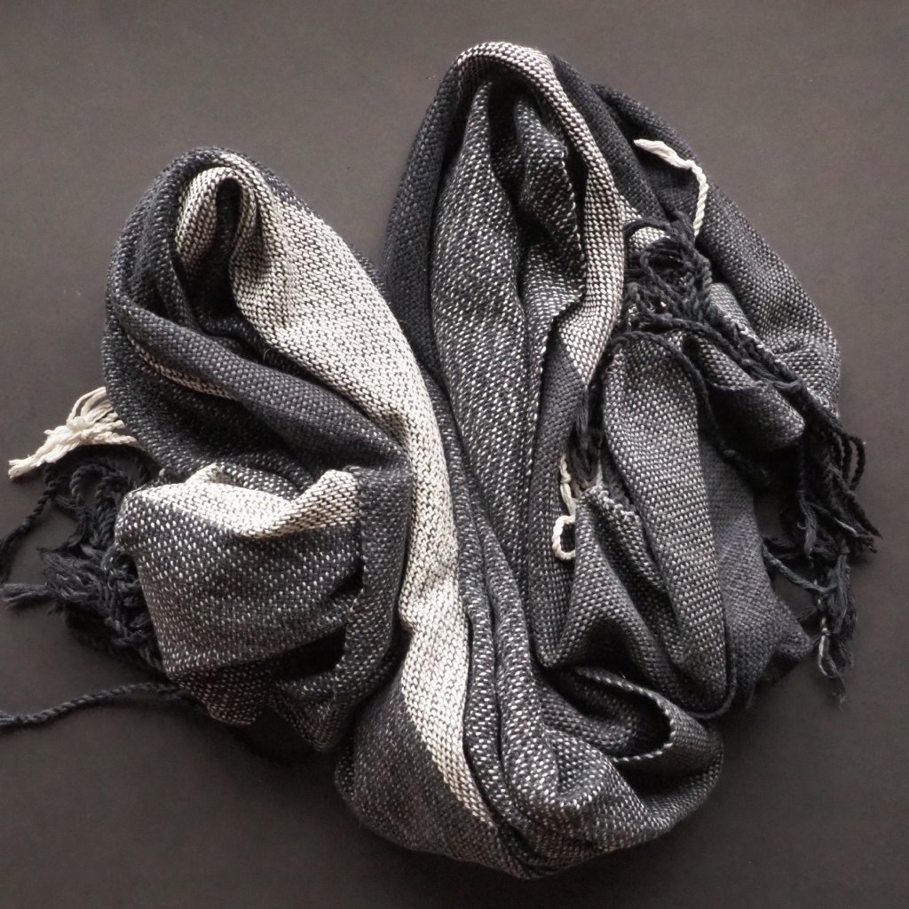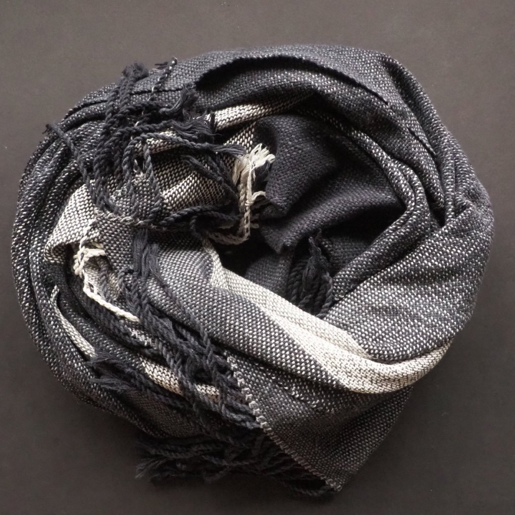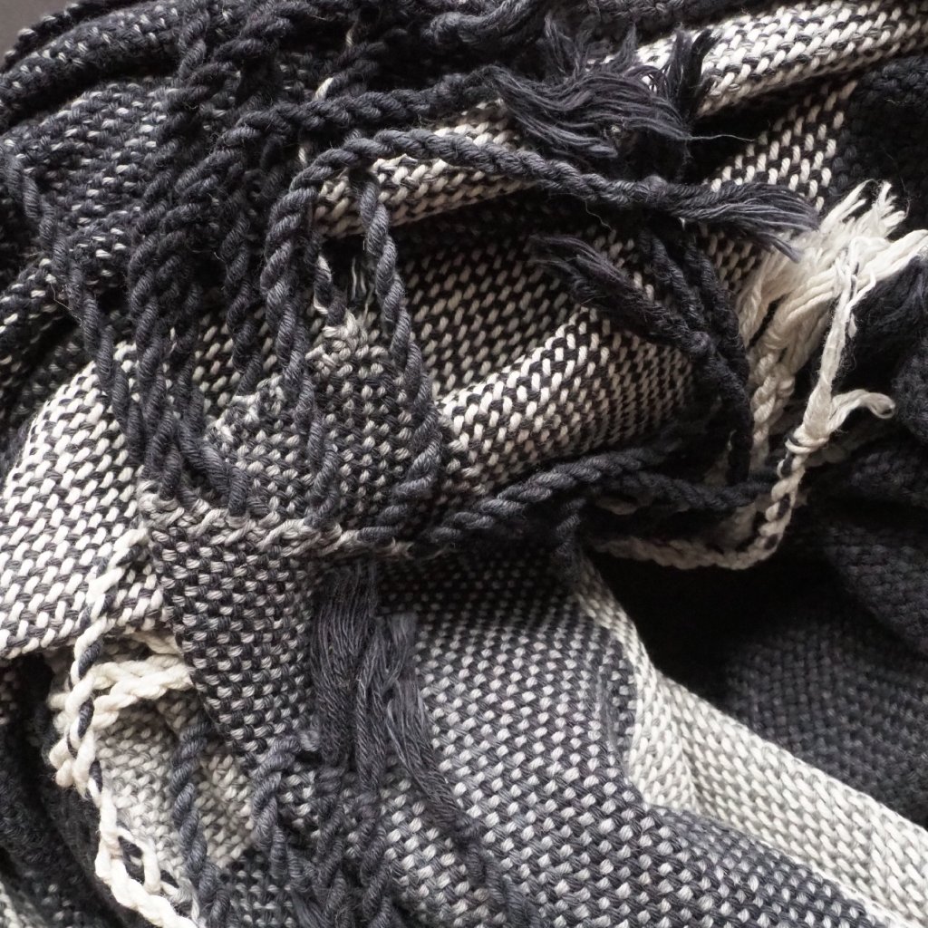 Pléd z mé oblíbené řecké bavlny, v osnově s přízí melírově barvenou v temnější odstínech šedé, až k černé, a s jedním kontractím bílým pruhem, a v útku s přízí přecházející mezi různými odstíny šedé v širokých intervalech, které ve výsledné tkanině tvoří různě široké pruhy. Celek je spíše lehčí, ale díky své velikosti v zimě zahřeje namuchlaný ke krku, a v létě jej můžete využít jako přehoz k plavkám. Neutrální studené tóny jsou snadno kombinovatelné s jinými barvami, a nebo mohou lehce oživit čistě černý šatník. Ideální kousek pro ty z vás, kdo hledáte jeden veganský kousek na celoroční nošení, nebo lehčí, ale širokou šálu vedlé svého zimního kašmíru či huňaté vlny.