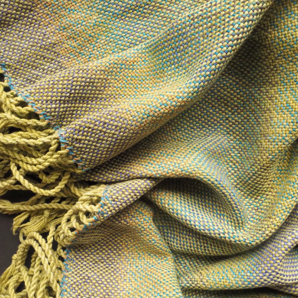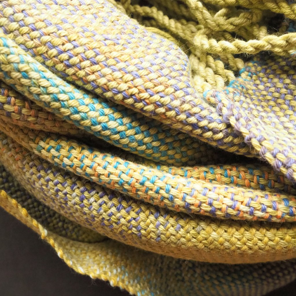 Pléd z mé oblíbené řecké bavlny, nabarvené podle německého receptu. V osnově jsem použila přízi v jemně přecházejících odstínech světle zelené , v útku pak přízi přecházející v nepravidelných intervalech mezi fialovou, žlutou, tyrkysovou a dalšími příbuznými barvami. Využila jsem celou šířku svého nejširšího stavu, a výsledek je tak široký ale přitom relativně lehký pléd na celoroční použití pro otužilé, vegany nebo ty z vás, které jakákoliv živočišná příze dráždí svých chemickým složením nebo fyzickou strukturou. Ostatní jej využijí od jara do podzimu jako lehký přehoz přes ramena, ať už pod ním budou plavky, tričko s krátkým rukávem, nebo sportovní blejzr.