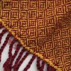Šála z jemné a přitom trvanlivé směsi vlny (80%), kašmíru (10%) a hedvábí (10%). Šálu jsem utkala na stavu se čtyřmi listy, který mi dovolil vytkat pravidelný opakující se vzor. Osnova je vínová, útek zlatavě žlutý.
