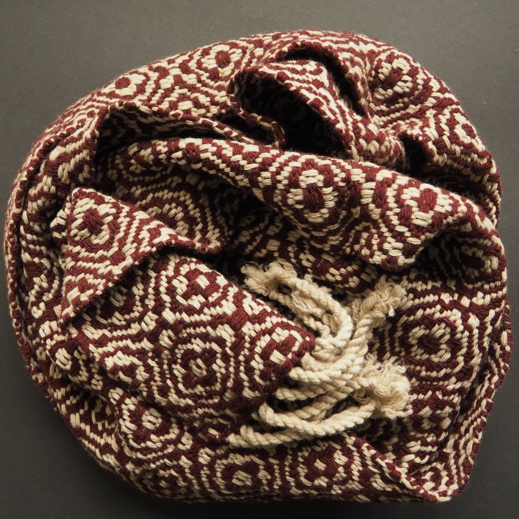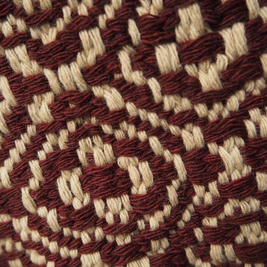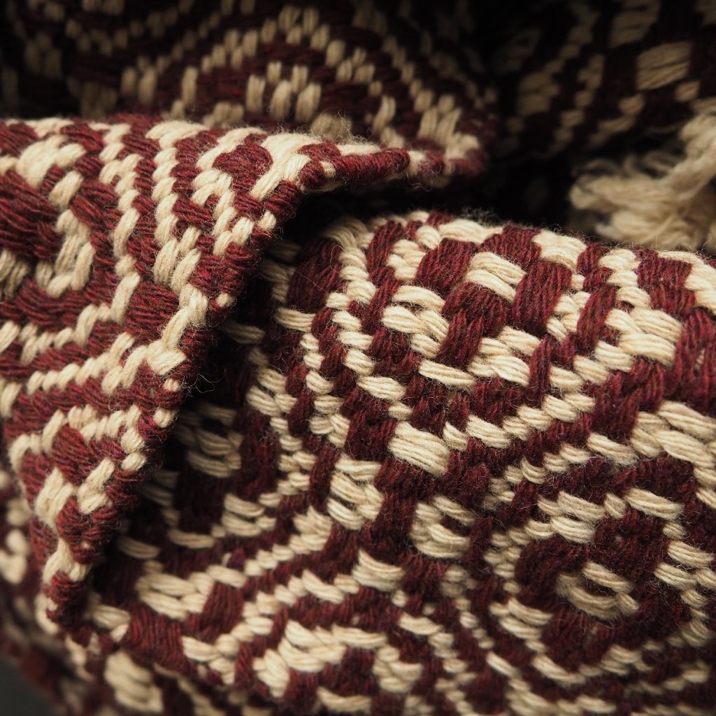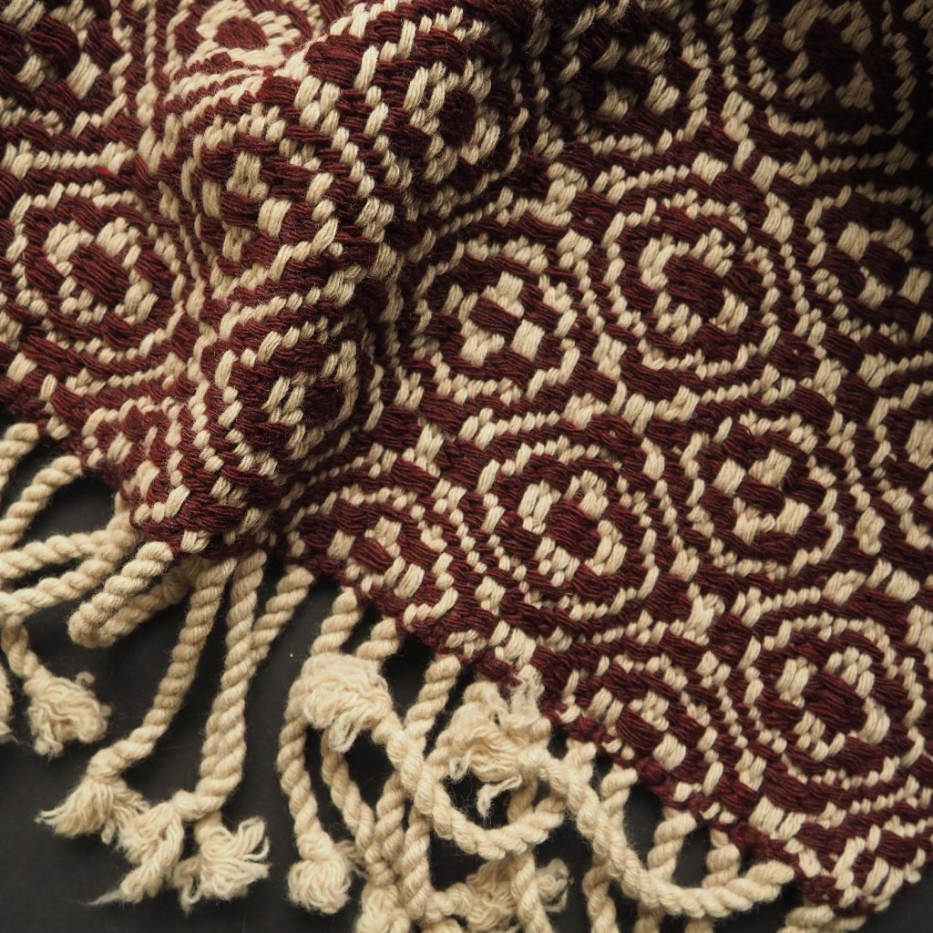 Šála s vytkávaným vzorem tvořícím velké růžice. Použila jsem na ni velmi jemnou silnější ovčí přízi (tzv. Geelong), která je tvořená několika tenčími málo zkroucenými pramínky. To ji dává nadýchanější charakter a dovoluje vyniknout tkanému vzoru nejen co do barev, ale také plastičnosti. V osnově jsem použila béžovou a v útku vínovou barvu této příze. Celkově je tkanina silnější, takže i když je šála úzká, udělá na krknu krásný objem a zahřeje.