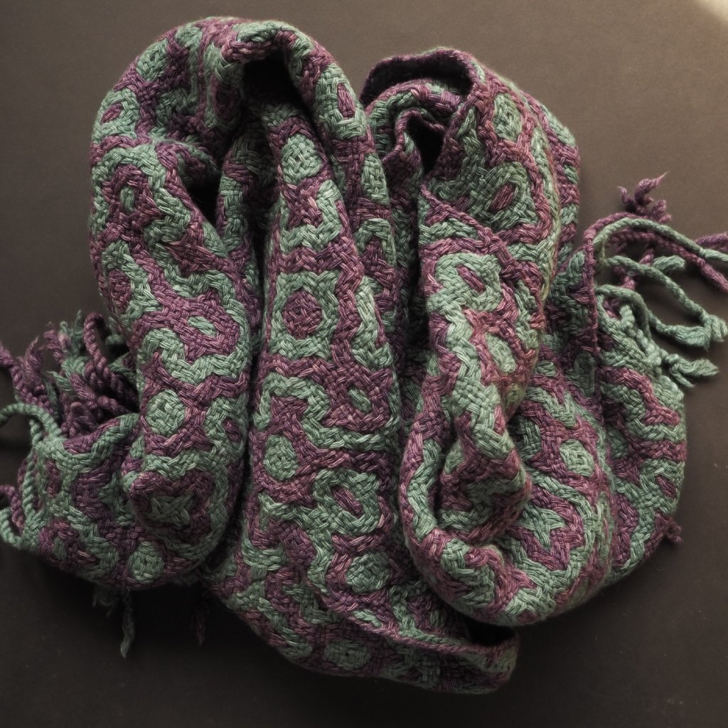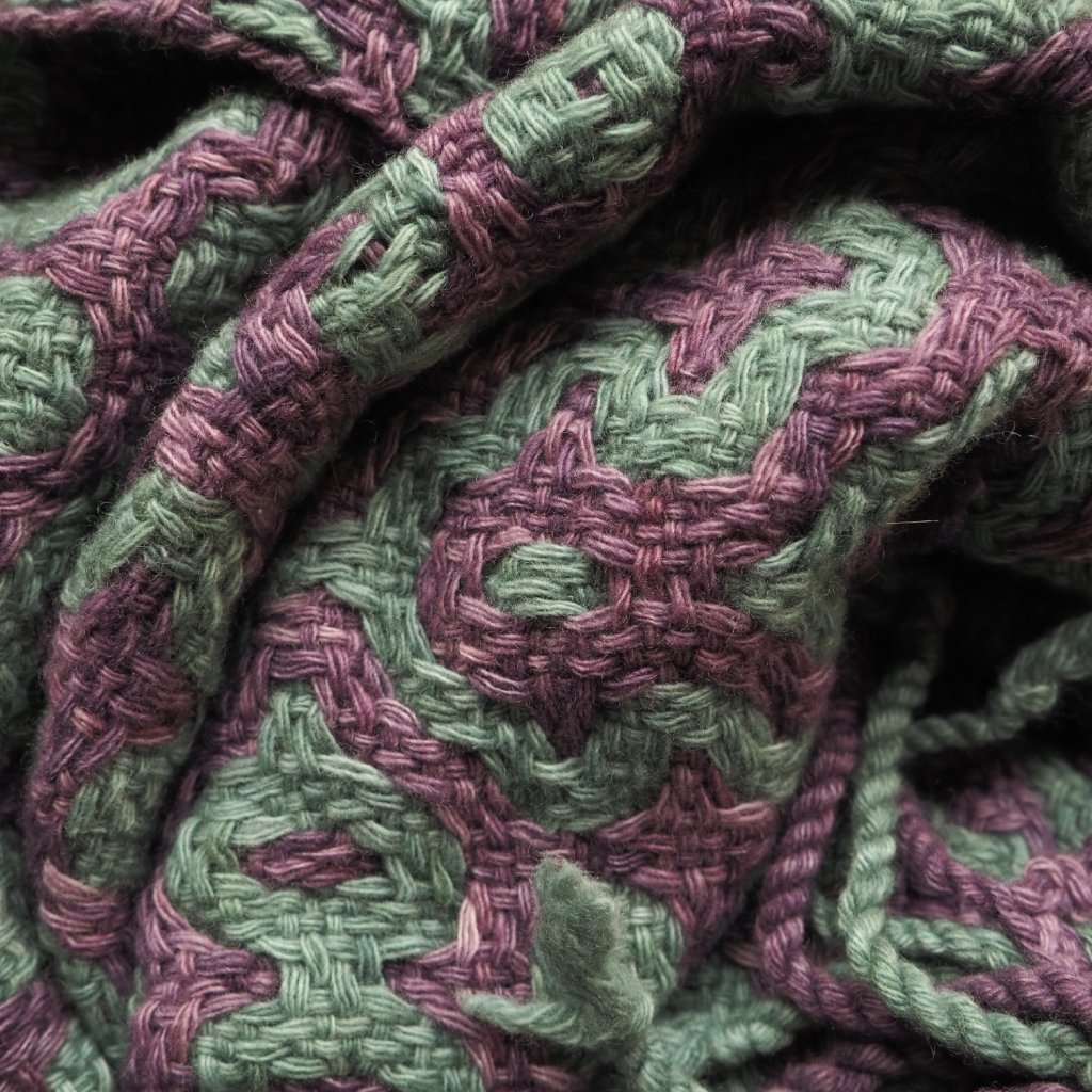 Pléd utkaný technikou, která prolíná dvě vrstvy v plátnové vazbě tak, aby vytvářely vzor. Zvolila jsem pro něj přízi z čisté vlny ovcí merino složenou z několika sdružených jednonitek, která ještě dodává nadýchanosti a zakulacenosti výsledných vytkaných tvarů, které jsou pro tuto techniku typické. Ještě před tkaním jsem příze ručně nabarvila, na tlumenou šedavě zelenou a opět lehce potlumenou švestkovou. Pléd je trochu širší než je můj průměr, a díky zvolené technice silnější a objemnější. Využijete jej tedy hlavně ve studenějších částech roku. Ale nebojte, i přes svou mohutnost není příliš těžký.