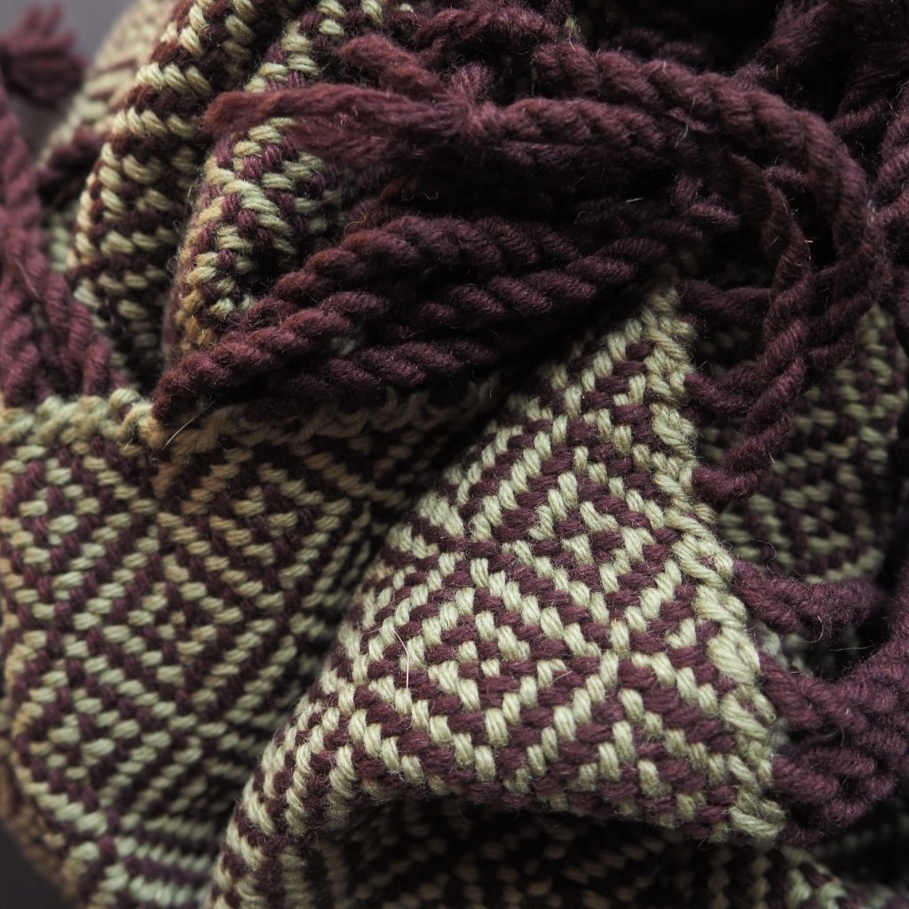 Vytkávaný pléd s lomeným hrotovým keprem, s tmavě červenou až bordó osnovou a světle zeleným khaki útkem. Příze jsou z většiny z vláken ovcí merino (70 %) doplněné kašmírem (30 %). Díky vzoru je pléd trochu silnější než by byl v plátnové vazbě, je krásně nadýchaný a chumlavý. Využijete jej především v chladnějších měsících, ale ležérně přehozený přes ramena může zdobit i po zbytek roku, i při těch nejslavnostnějších příležitostech.