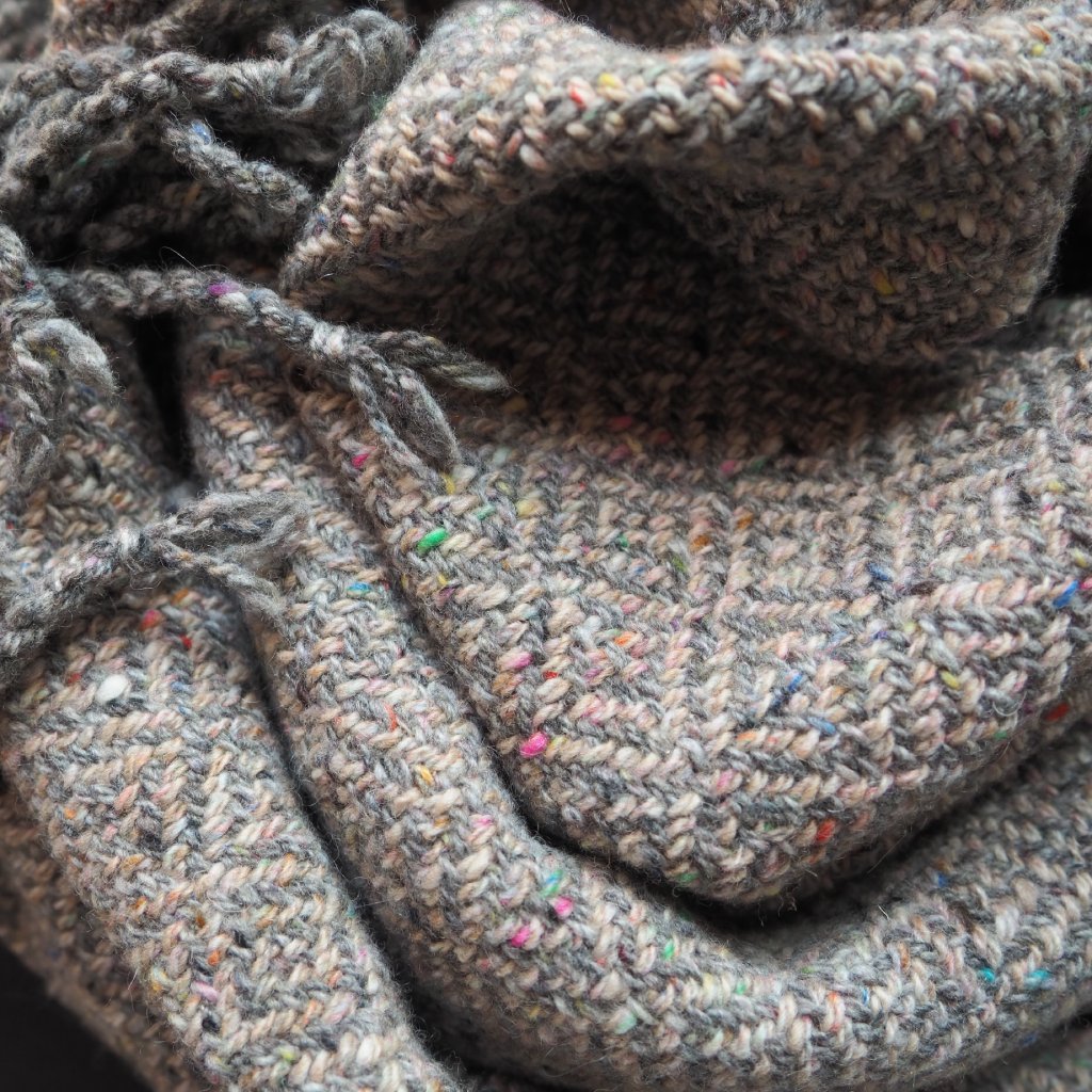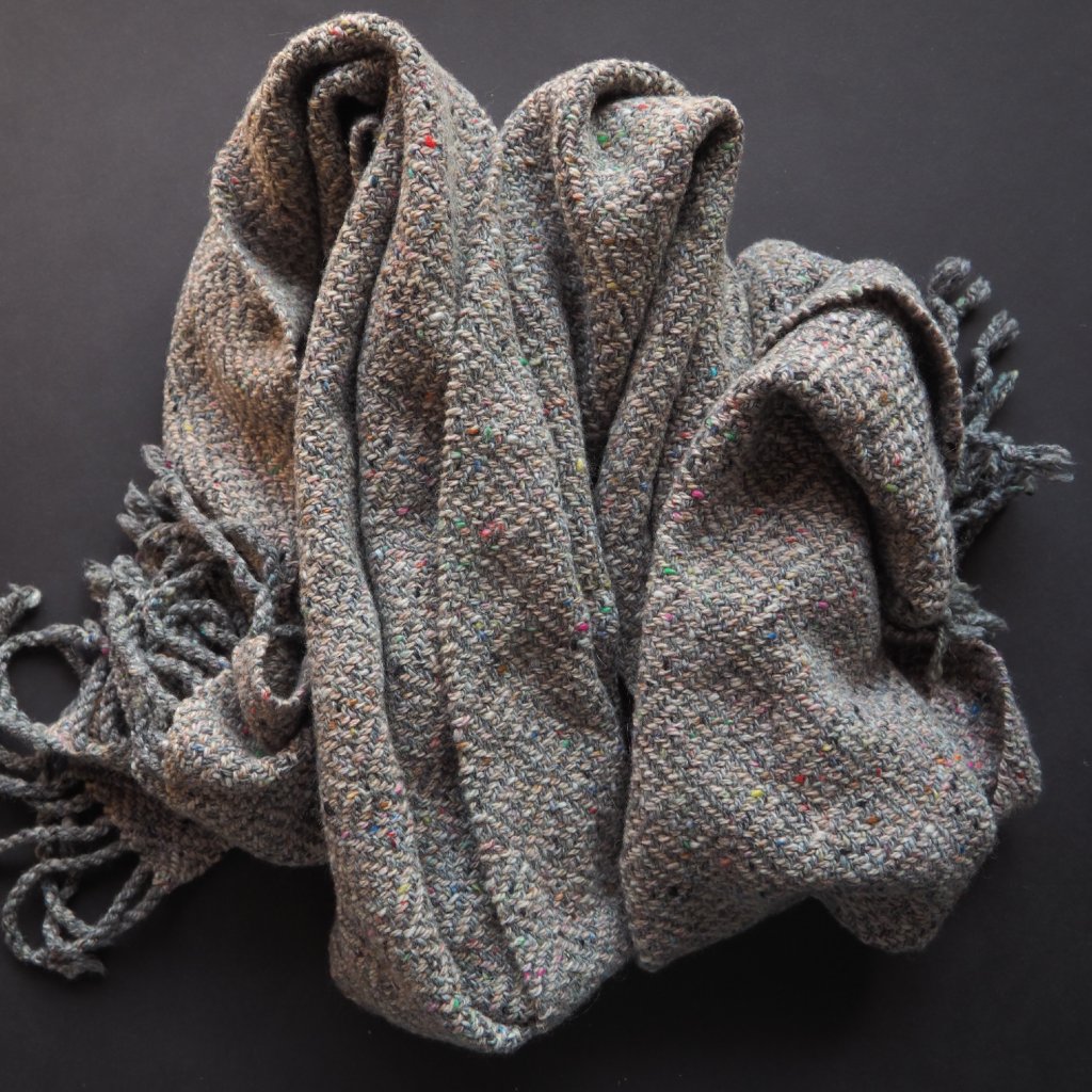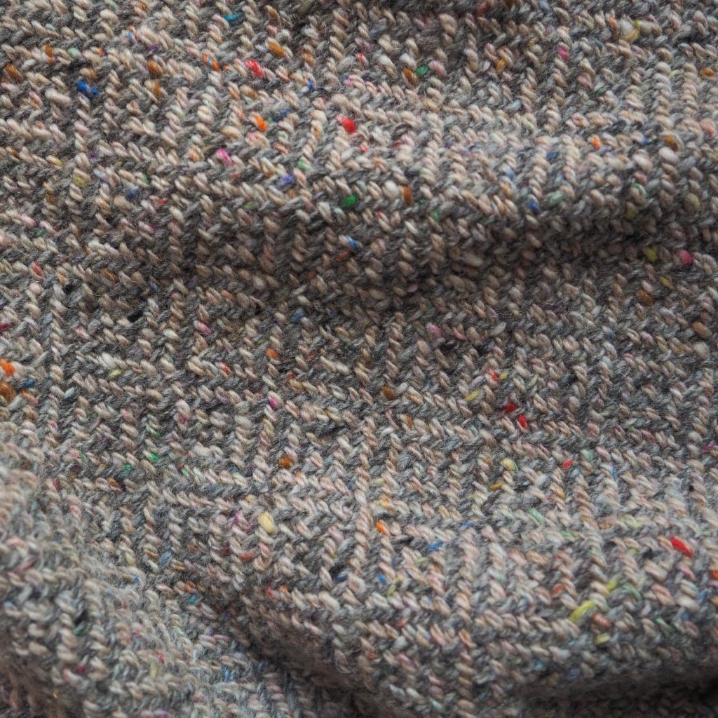Vytkávaný pléd s lomeným hrotovým keprem, s osnovou ze středně šedé nopkové příze a světle béžovým nopkovým útkem. Příze jsou z většiny z vláken ovcí merino (70 %) doplněné kašmírem (30 %). Díky vzoru je pléd trochu silnější než by byl v plátnové vazbě, je krásně nadýchaný a chumlavý. Využijete jej především v chladnějších měsících, ale ležérně přehozený přes ramena může zdobit i po zbytek roku, i při těch nejslavnostnějších příležitostech.