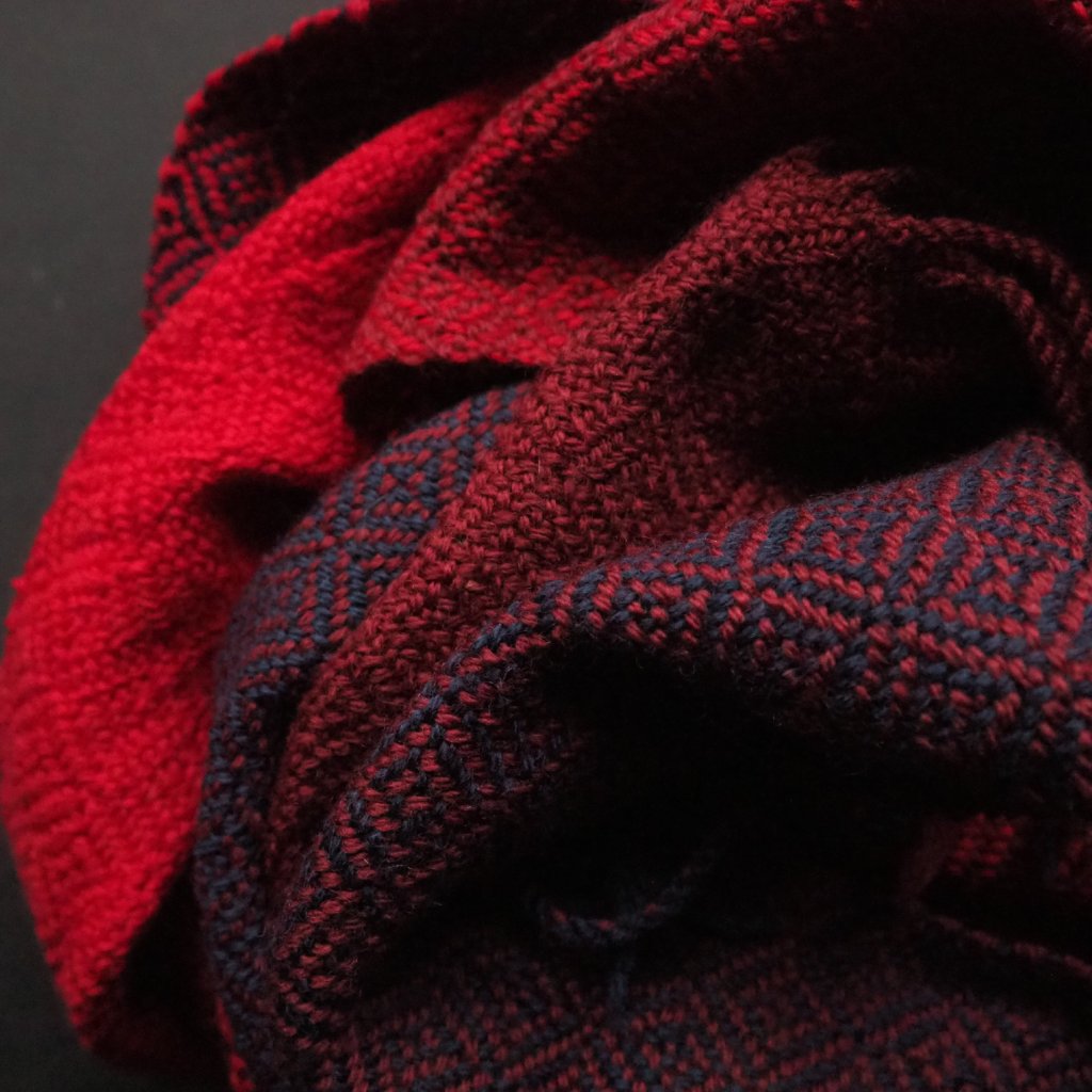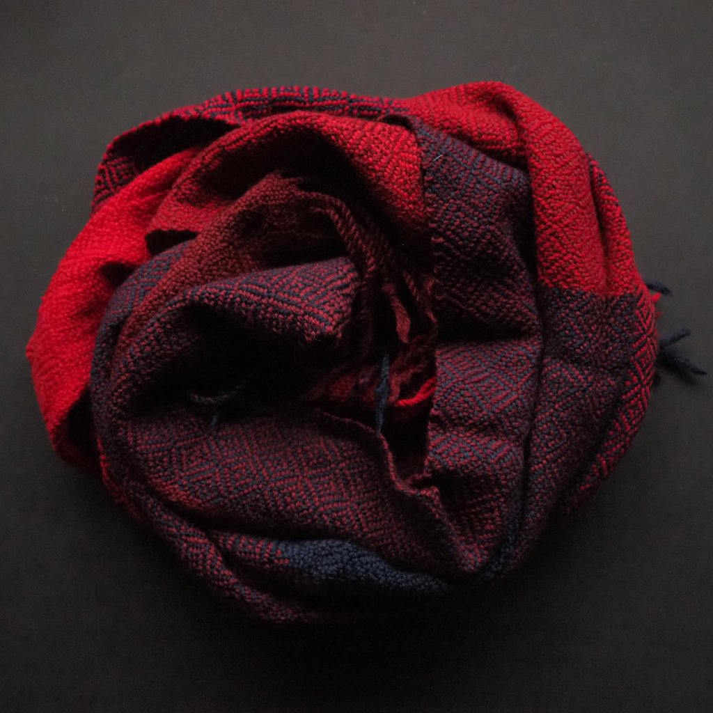 Náznak exotiky, zněl by popis tohoto kousku ve dvou slovech. Použitá příze je z 30 % z velbloudího vlákna (zbytek tvoří ovčí vlna merino), vytkávaný vzor je povědomý, ale stejně lehce netradiční lomený kepr, a čtyři použité barvy jsou celkem familiární, ale jejich kombinace dává vzpomenout na pálivé slunce a hřejivou příchuť koření. Barvy se střídají v osnově i v útku, a tam kde se stejná barva potká, je vzor plastický, ne barevný. Pléd je středně silný, dle mých měřítek k celoročnímu nošení. Bude vypadat dobře nachumlaný ke krku v límci kabátu, i ležérně přehozený přes ramena k formálnímu oděvu.